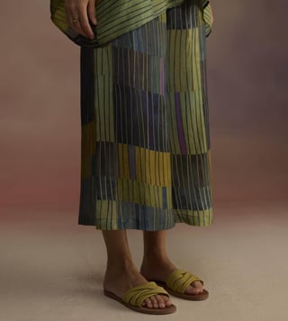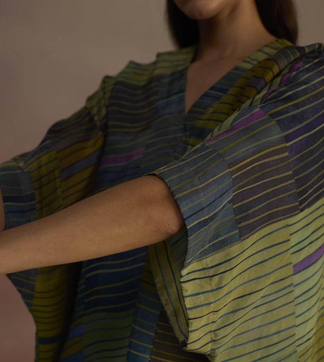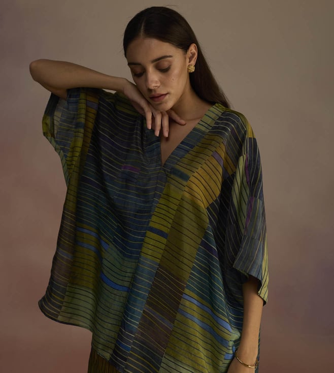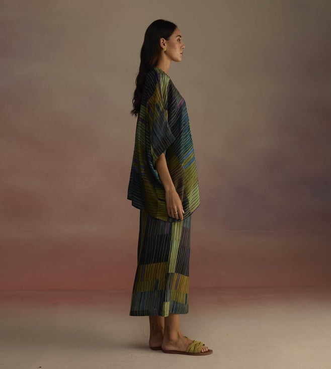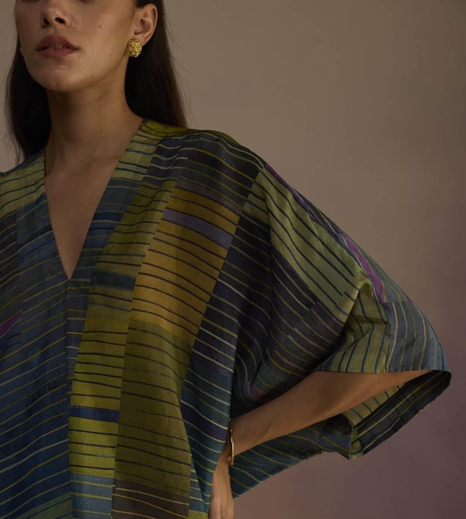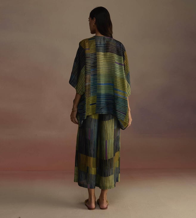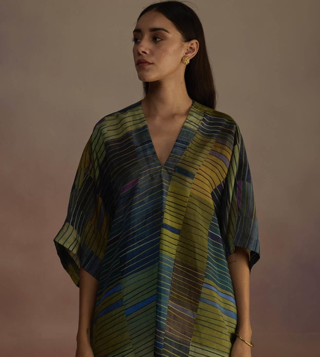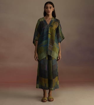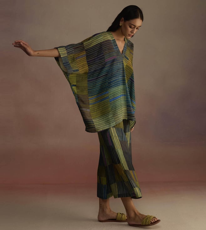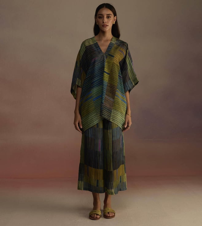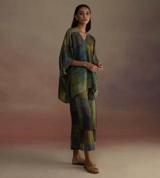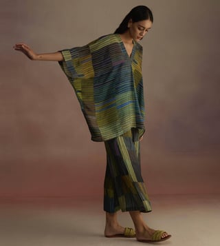 The set features a kaftan in habutai silk, adorned with hand-sketched aymmetrical stripes paired with matching wide-legged pants for a perfect flowy, comfy yet classy festive look.Disclaimer: All Other Items In The Image Are Only For Display Purposes And Will Not Be A Part Of The Delivery Content. Product Colour May Slightly Vary Due To Photographic Lighting Sources. Country Of Origin - India.