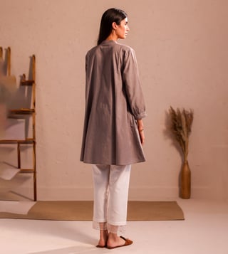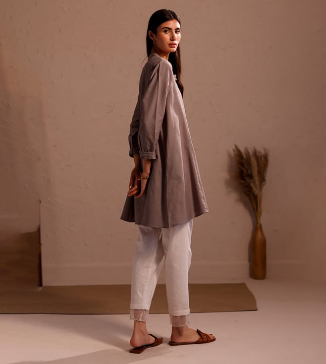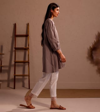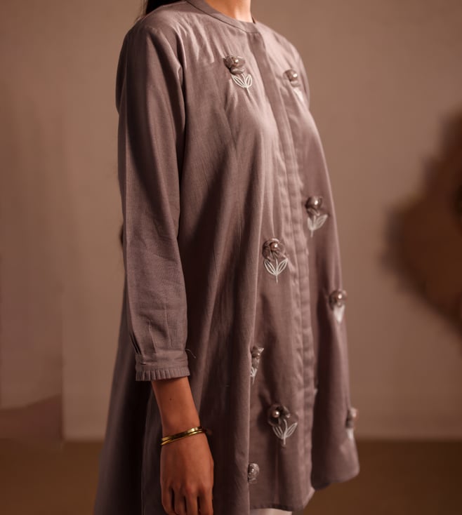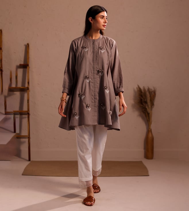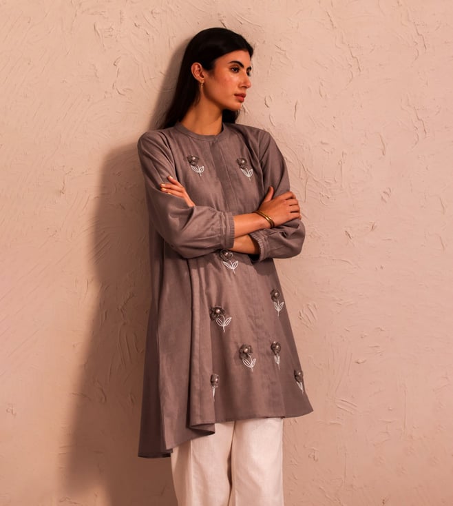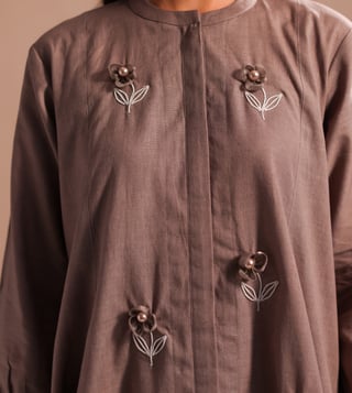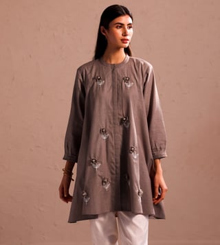 This linen tunic has pleated cuffs and hand-embroidered 3D flowers in an asymmetrical cut. The high-low tunic can be worn as a dress as well as paired with pants. Disclaimer: All other items in the image are only for display purposes and will not be a part of the delivery content. Product colour may slightly vary due to photographic lighting sources. Country of Origin - India.