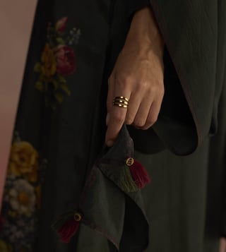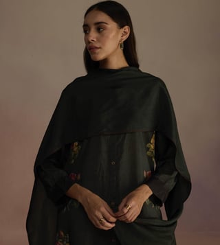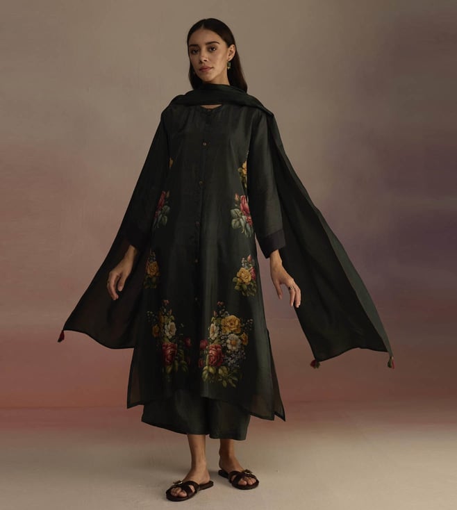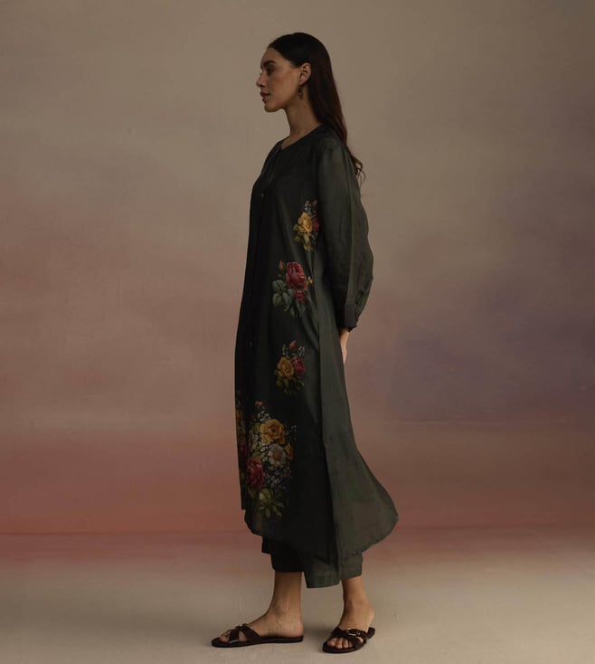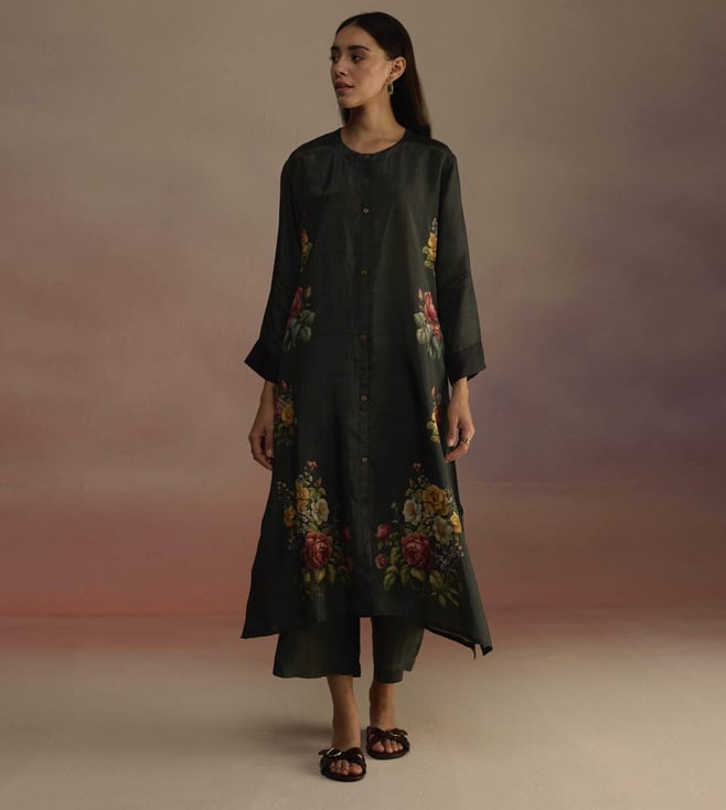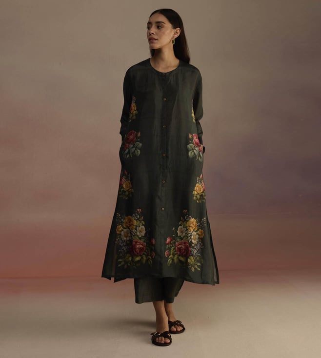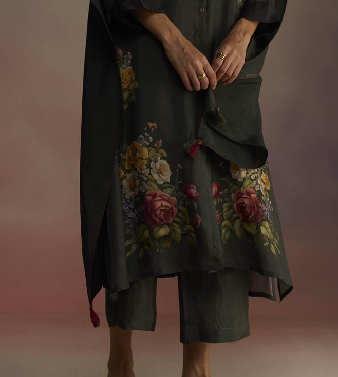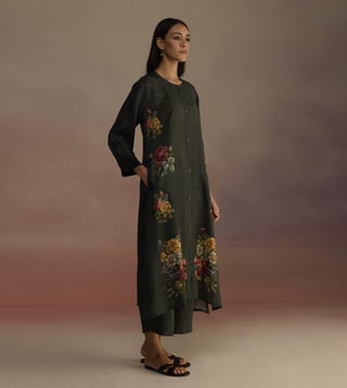 An open panel kurta set with a cascading floral print kurta featuring signature Roza buttons and color-blocked cuffs. The set comes with a pair of wide legged pants. Disclaimer: All Other Items In The Image Are Only For Display Purposes And Will Not Be A Part Of The Delivery Content. Product Colour May Slightly Vary Due To Photographic Lighting Sources. Country Of Origin - India.