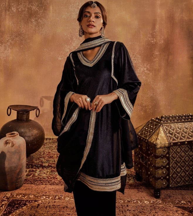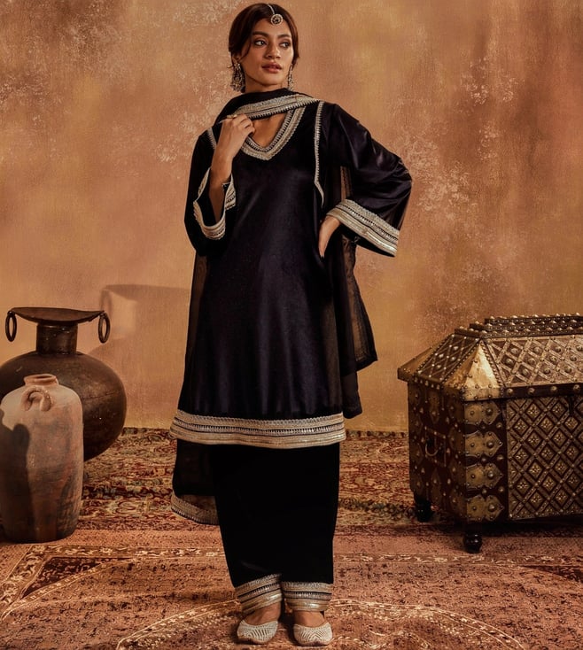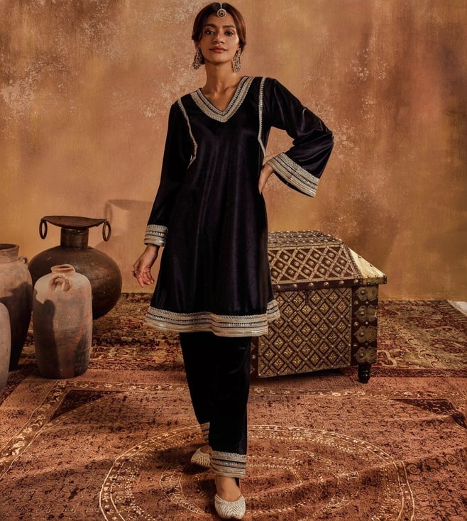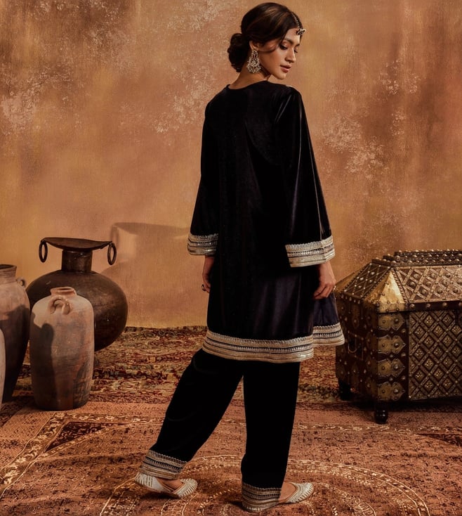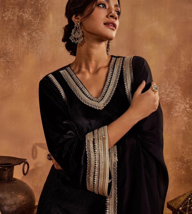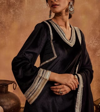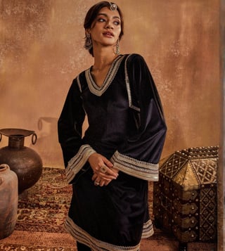 Timeless classics, exclusively for your bespoke taste. Experience luxury with this one-of-a-kind black velvet kurta set, featuring intricate golden lacework that adds a touch of opulence. Paired with matching wide-leg pants tailored to perfection, this ensemble exudes sophistication and elegance, making it the ideal choice for those who appreciate refined craftsmanship and luxurious style.