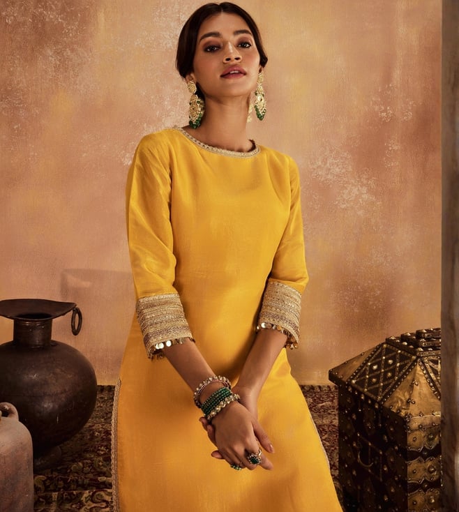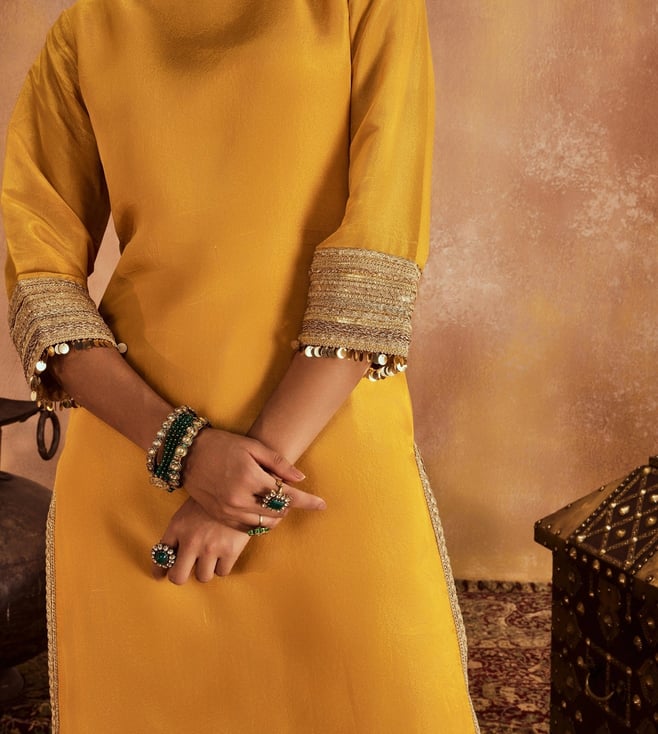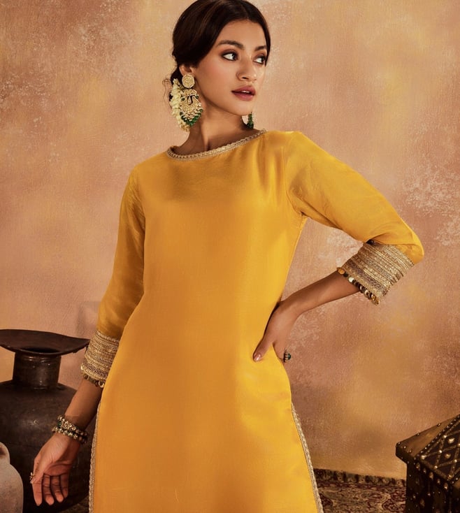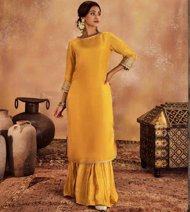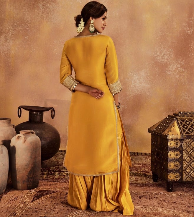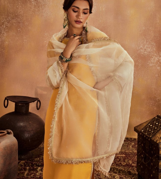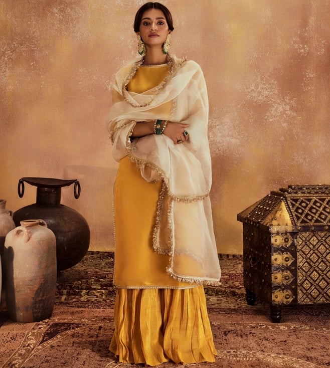 Add to your serenity and glow with this stunning yellow sharara set. The elegant yellow tissue kurta and sharara are beautifully complemented by a mukaish organza dupatta, adding a touch of sparkle and sophistication. This set exudes timeless elegance and grace, making it the perfect choice for any festive or special occasion, ensuring you stand out with poise and style.