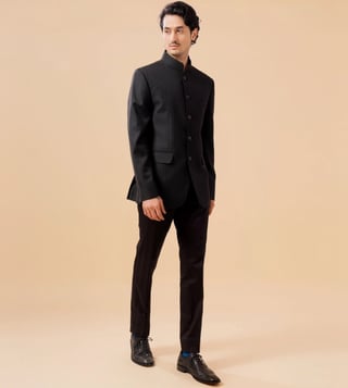 Devise a modish style statement by wearing this Bandhgala. It is crafted with care using blended cotton. This jacket has contrast pin stripe details and minimalistic style details to highlight it's simplistic elegance. Pair it with trousers and shoes to complete the look. Disclaimer: All other items in the image are only for display purposes and will not be a part of the delivery content. Product colour may slightly vary due to photographic lighting sources. Country of Origin - India.