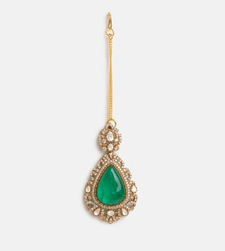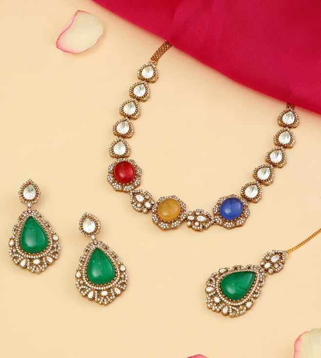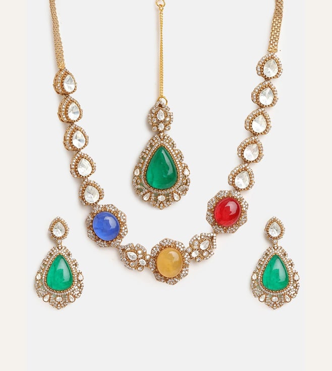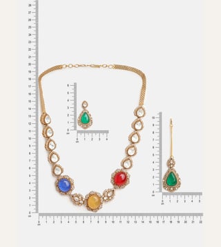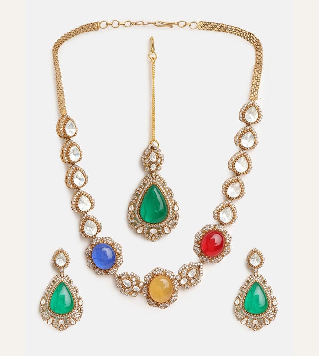 Ruby Raang Stonework Kundan Necklace With Earrings And Maang Tikka