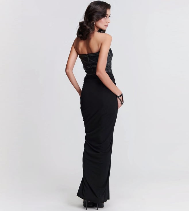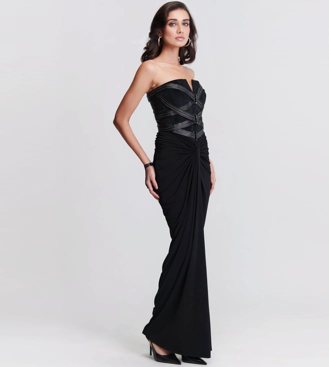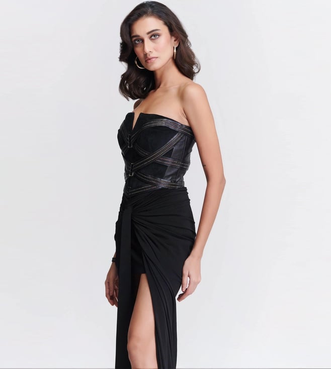 Become a style icon by wearing this corset gown from the Dazzle collection. It is curated using a poly jersey. This corset gown with faux leather detailing represents a vision of modern bold dressing. The draped bottom with an added slit adds glamour to the look upgrading your fashion quotient. Disclaimer: Product colour may slightly vary due to photographic lighting sources. Country of Origin - India.