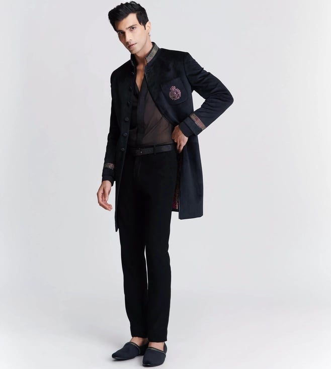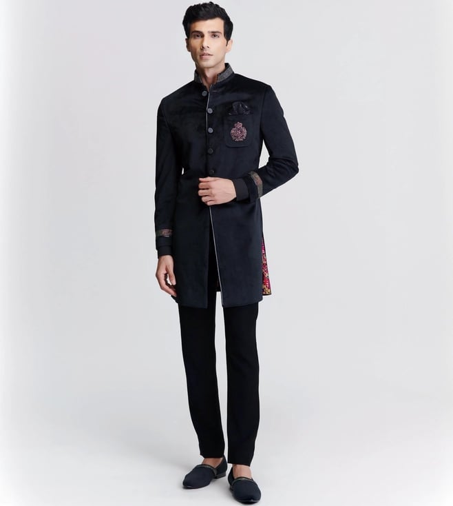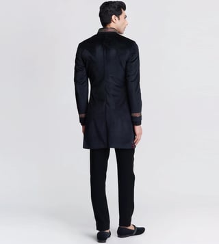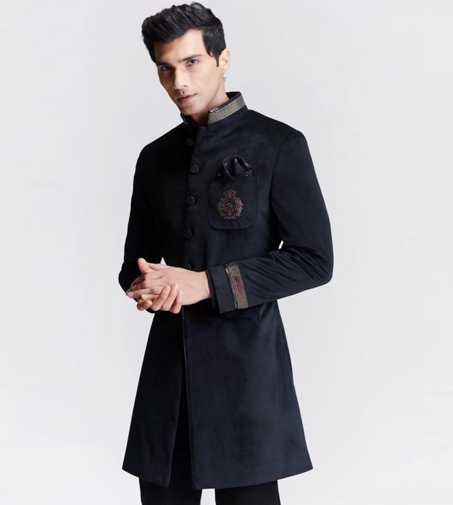 Step out in style by wearing this sherwani from the Dazzle collection. It is curated using velvet. This sherwani is designed for the millennial man. An interplay of traditional values and modern spunk, this sherwani features faux leather finishing on the collar and crystals crest on the pocket. Disclaimer: All other items in the image are only for display purposes and will not be a part of the delivery content. Product colour may slightly vary due to photographic lighting sources. Country of Origin - India.