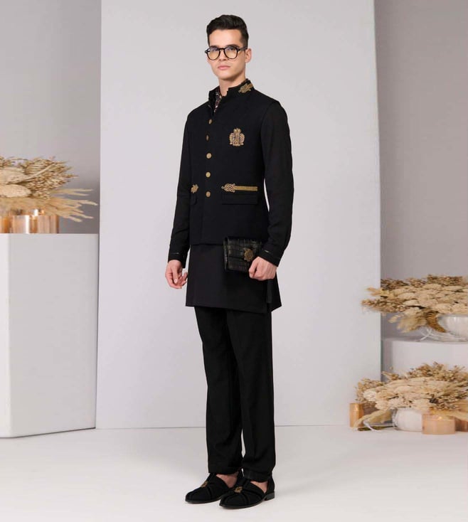 Channel a winning style effortlessly by wearing this black slim fit sleeveless ethnic jacket from SandN Shantnu Nikhil. Tailored to sartorial perfection from premium quality fabric, it assures a soft and soothing touch against the skin. The mandarin collar augments its design.