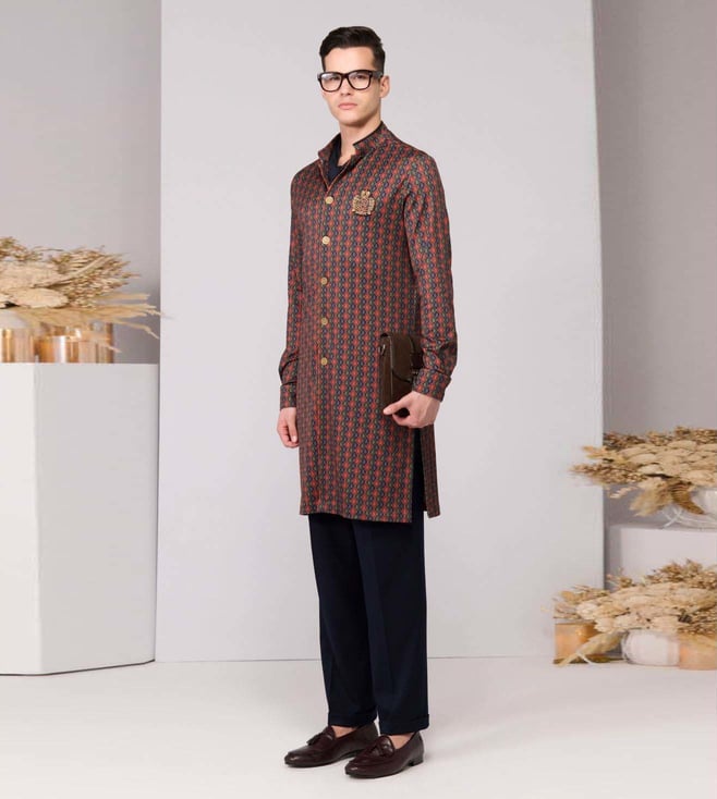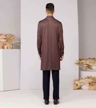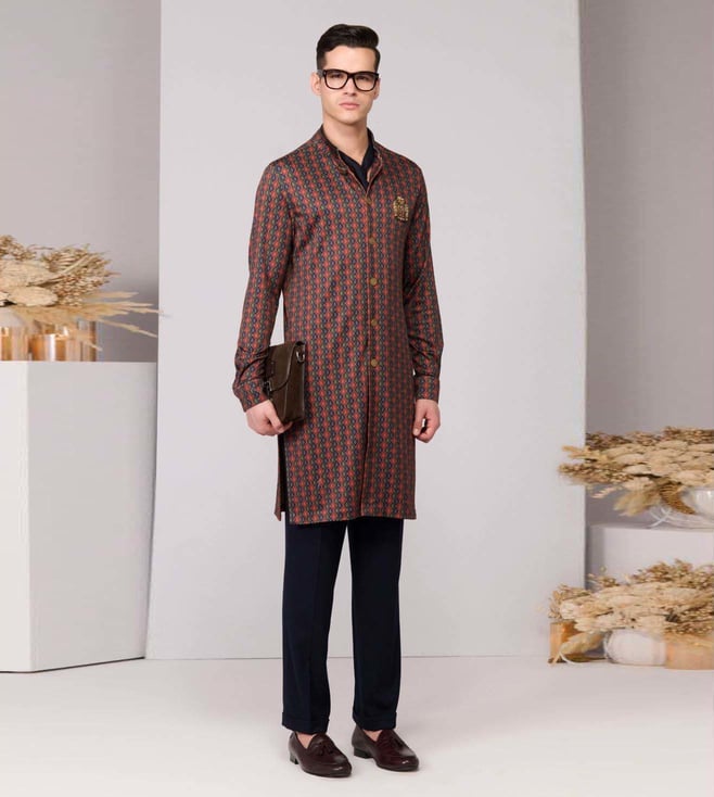 Revamp your wardrobe with this multicolored slim fit kurta from SandN Shantnu Nikhil. Tailored to sartorial perfection from premium quality fabric, it assures a soft and soothing touch against the skin. The mandarin collar augments its design. The printed pattern makes it a captivating choice.