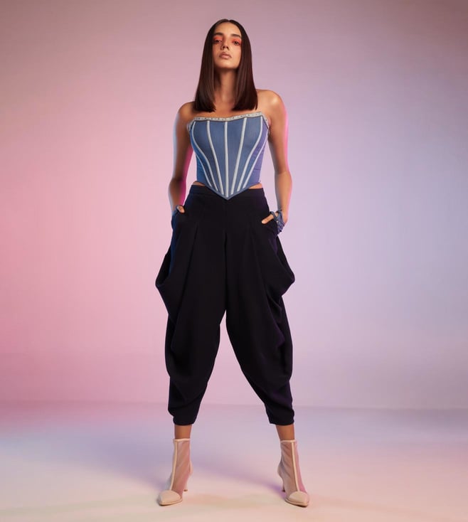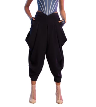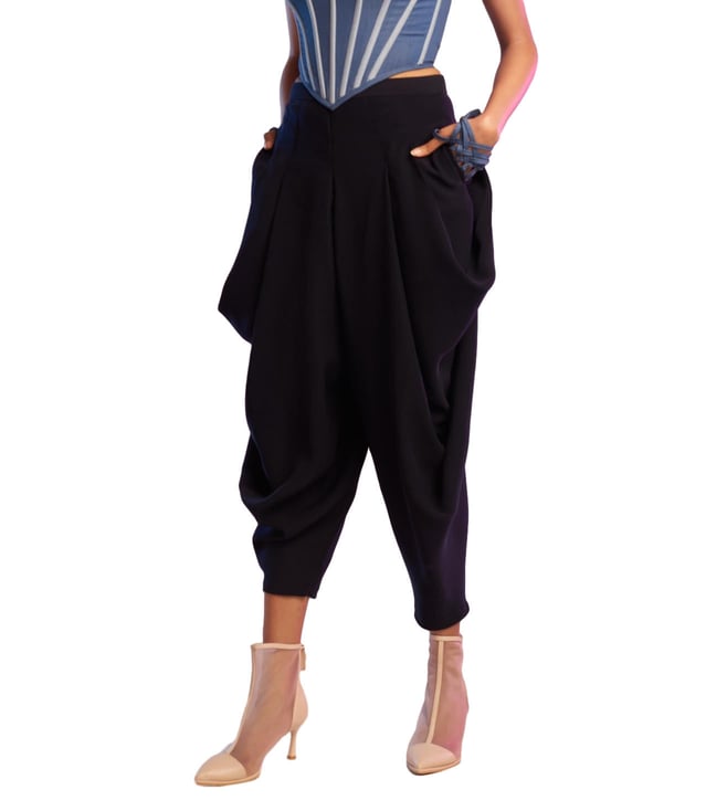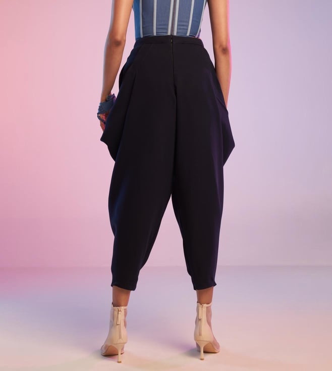 These unconventional navy cowl pants feature signature S&N drape. Pair it with a cropped shirt for a perfect evening look.