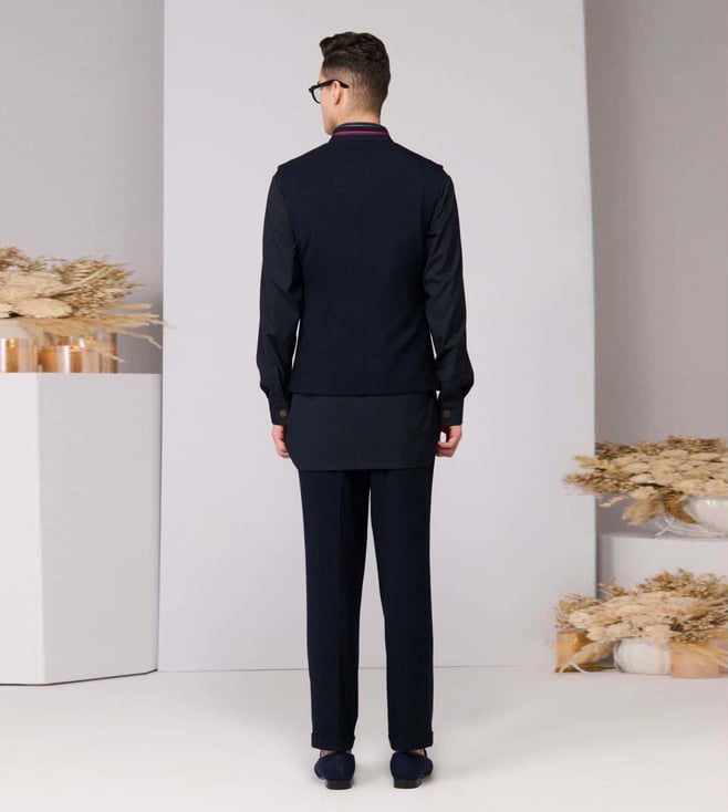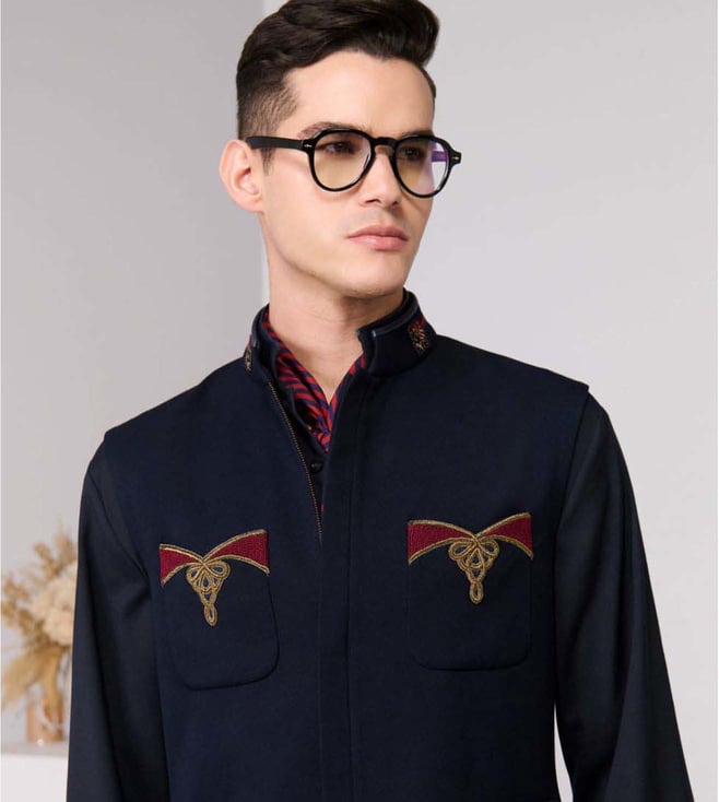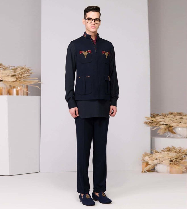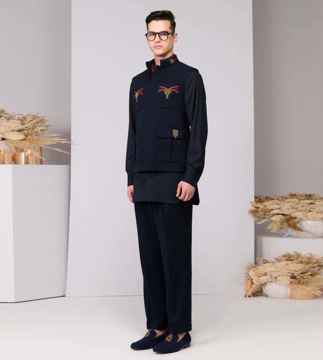 Curate a stunning look by wearing this navy slim fit sleeveless ethnic jacket from SandN Shantnu Nikhil. Tailored to sartorial perfection from premium quality fabric, it assures a soft and soothing touch against the skin. The mandarin collar augments its design.