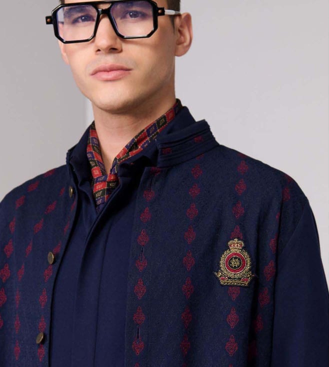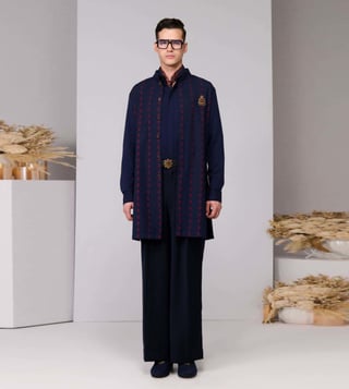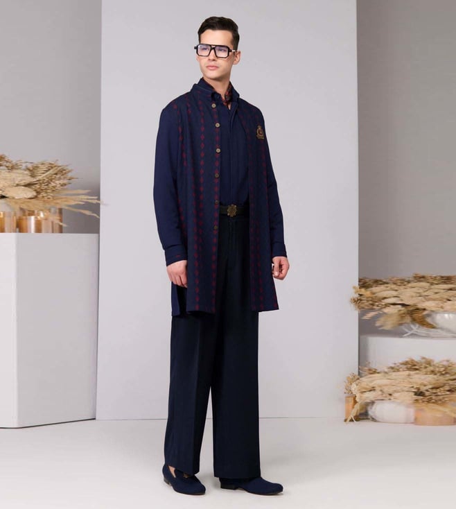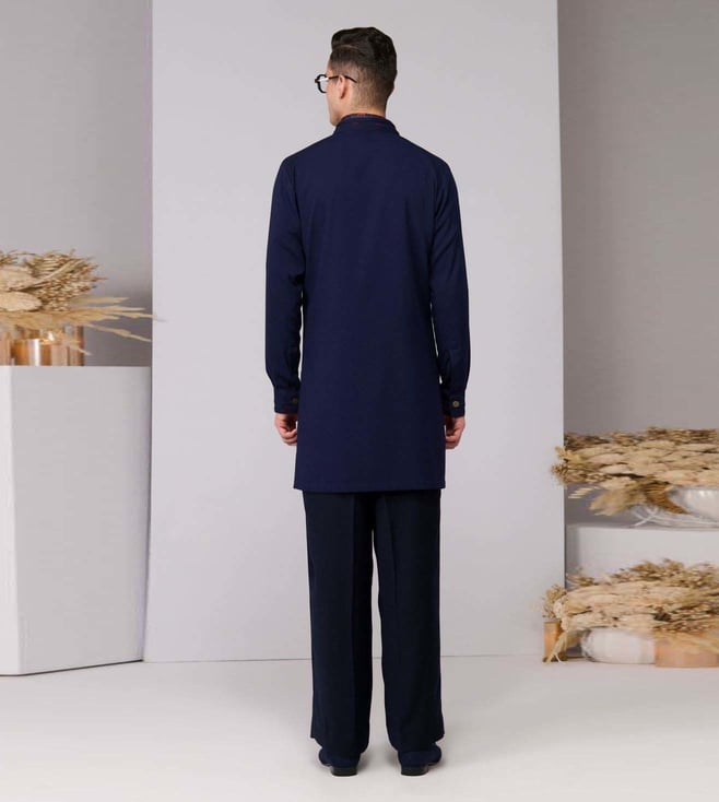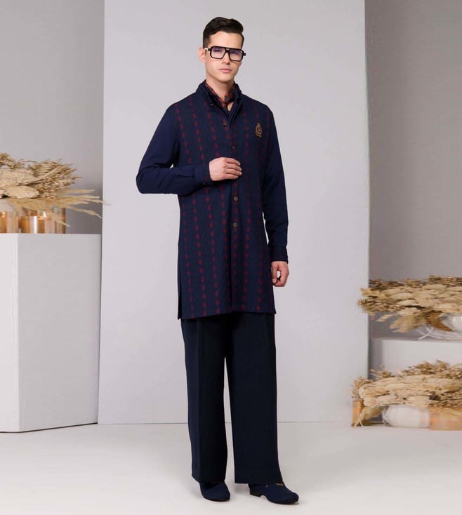 Add zest and zing to your look by wearing this navy slim fit long kurta from S&N Shantnu Nikhil. Tailored to sartorial perfection from premium quality fabric, it assures a soft and soothing touch against the skin. The mandarin collar augments its design. It emanates a brand logo which makes it a unique choice.