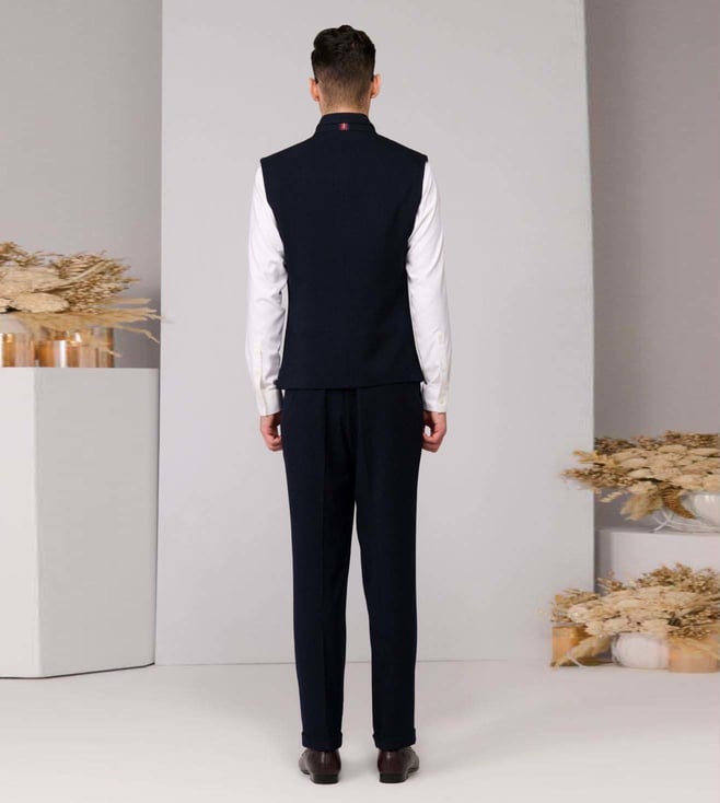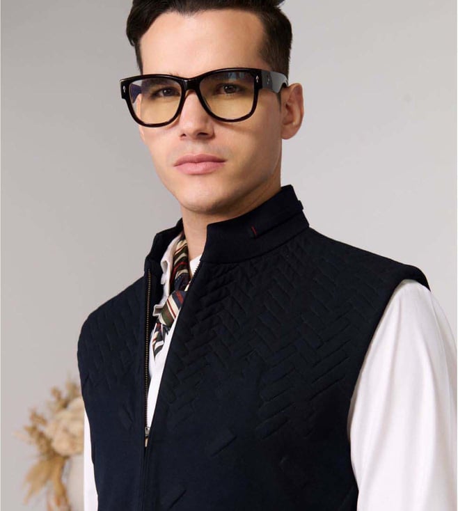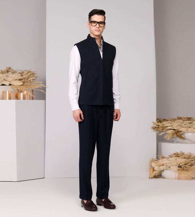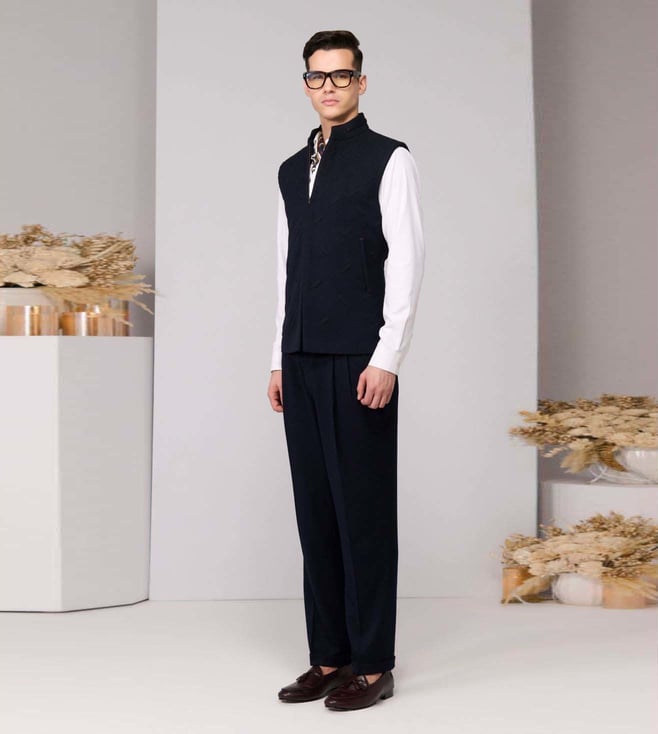 Curate a stylish look by wearing this navy slim fit sleeveless ethnic jacket from SandN Shantnu Nikhil. Tailored to sartorial perfection from premium quality fabric, it assures a soft and soothing touch against the skin. The mandarin collar augments its design. The textured pattern makes it a wardrobe classic.
