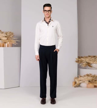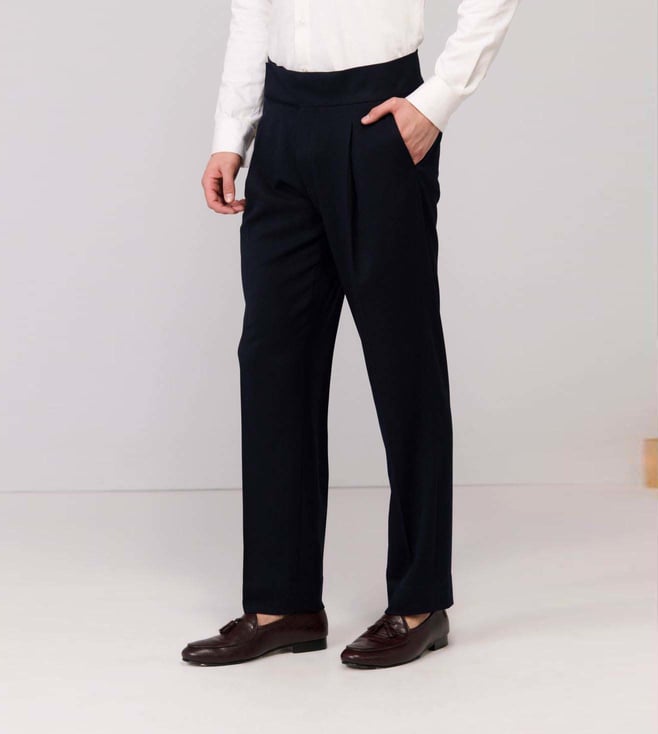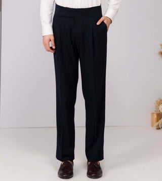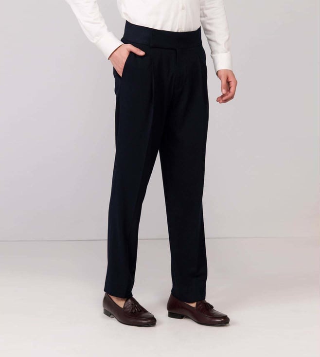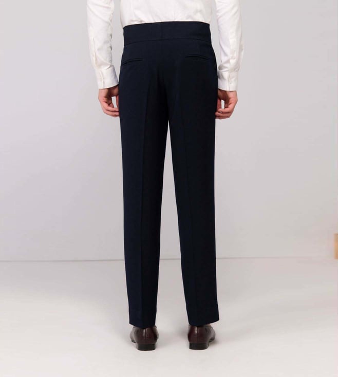 Slay the look by wearing this pair of navy slim fit trousers from SandN Shantnu Nikhil. Tailored to sartorial perfection from premium quality fabric, it assures a soft and soothing touch against the skin.