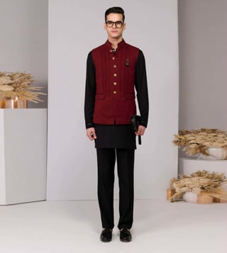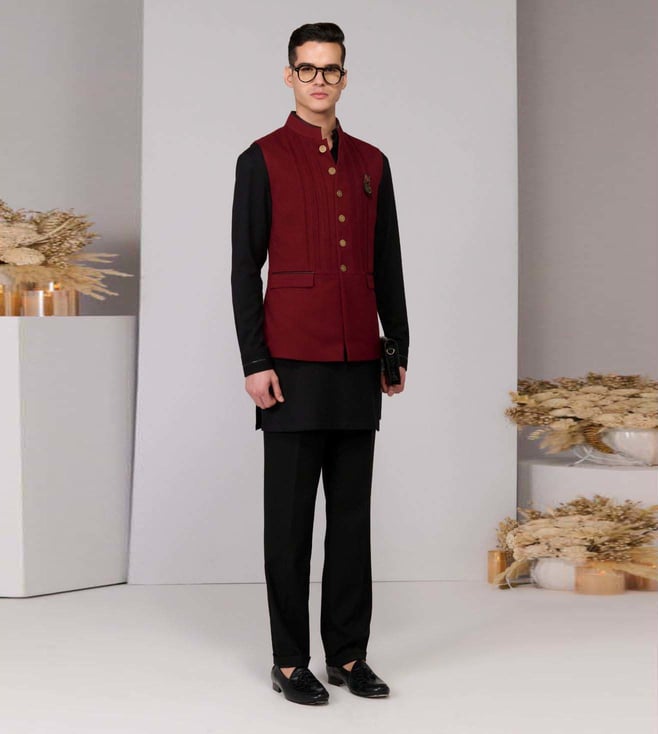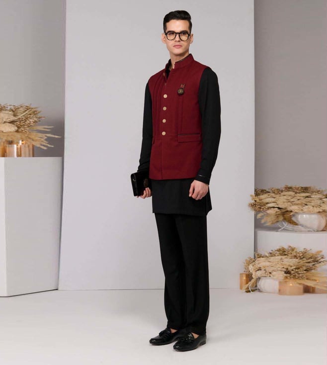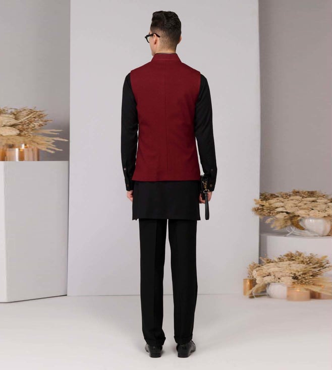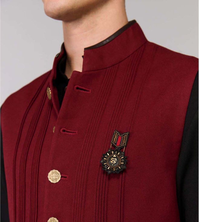 Give your wardrobe a fashionable spin with this red slim fit sleeveless ethnic jacket from SandN Shantnu Nikhil. Tailored to sartorial perfection from premium quality fabric, it assures a soft and soothing touch against the skin. The mandarin collar augments its design.