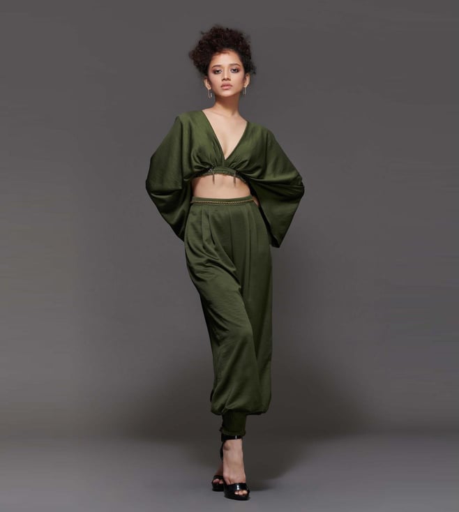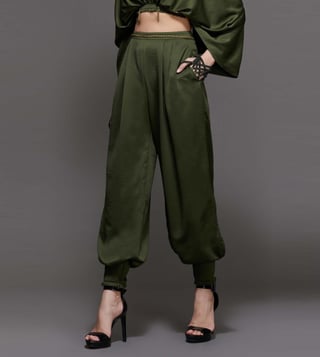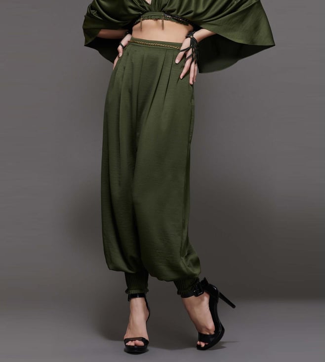 This pair of pleated drape pants from the Urban Myth collection by Shantanu & Nikhil comes with a clenched cuff. It also features metallic belt details on the waist. It is made using a panther crepe. Disclaimer: All other items in the image are only for display purposes and will not be a part of the delivery content. Product colour may slightly vary due to photographic lighting sources. Country Of Origin - India.