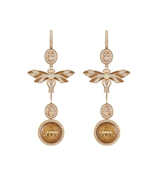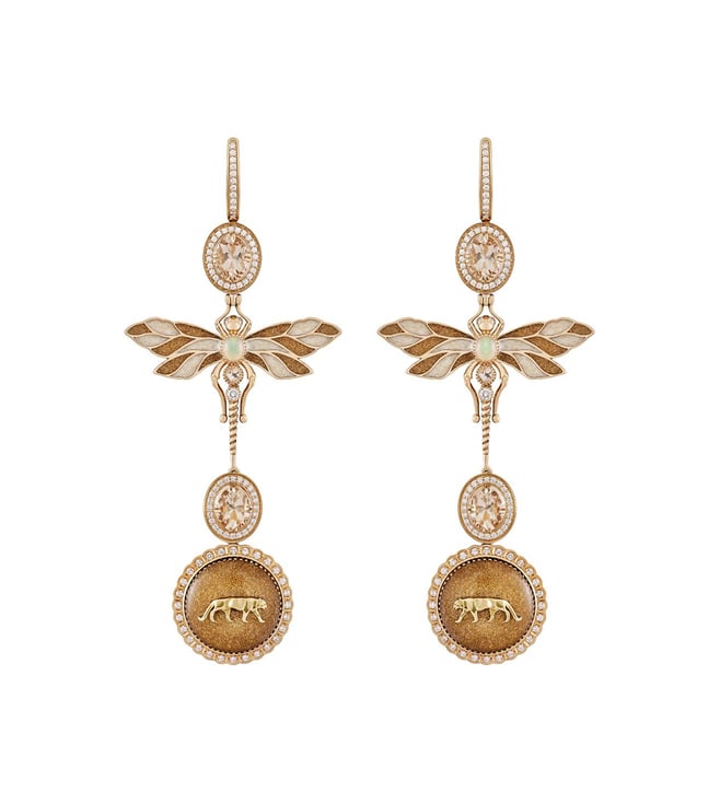 18k Gold statement earrings featuring the Dragonfly charm with Sahara Gold and Ivory lacquer enamel wings, Opal, Morganite and Diamond-set body details, a Sahara Gold lacquer enamel Royal Bengal Tiger insignia pendant and faceted Morganite gemstones each with Diamond halos- all fashioned in VVS-VS, E/F color Brilliant Cut Diamonds.