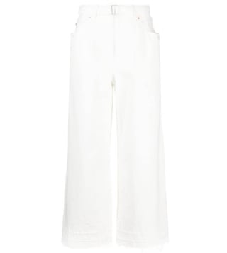 Elevate your wardrobe with the Sacai White Flared Jeans. Designed with high-waisted belted flared jeans from sacai featuring white, cotton, denim, flared design, cropped leg, high-waisted, belt loops, belted waist, front hook and eye fastening, two side inset pockets, two rear patch pockets and frayed hem. this piece fits true to size. we recommend you get your regular size, model is 1, 75m / 5ft 8in wearing size 1 (num), these trousers combine comfort and sophistication for everyday wear.