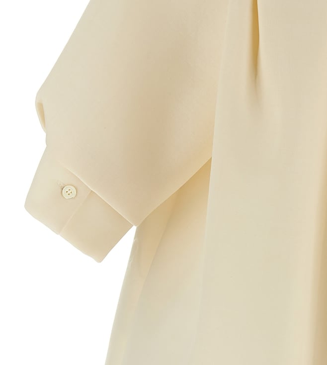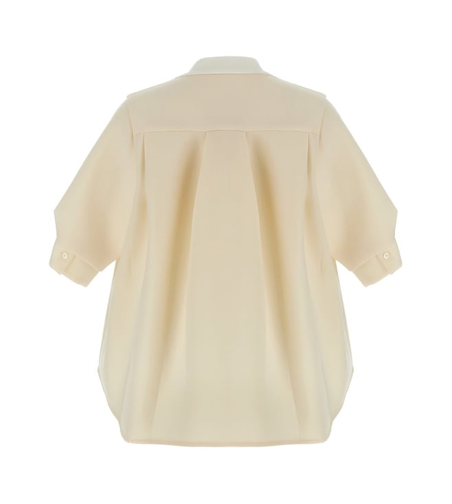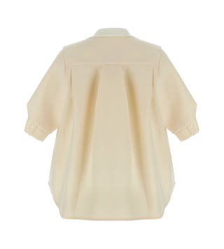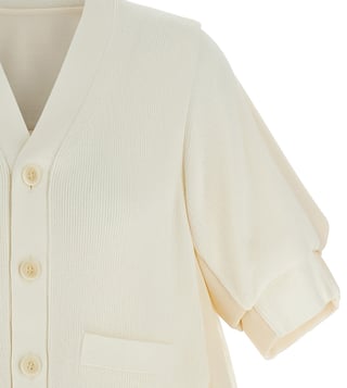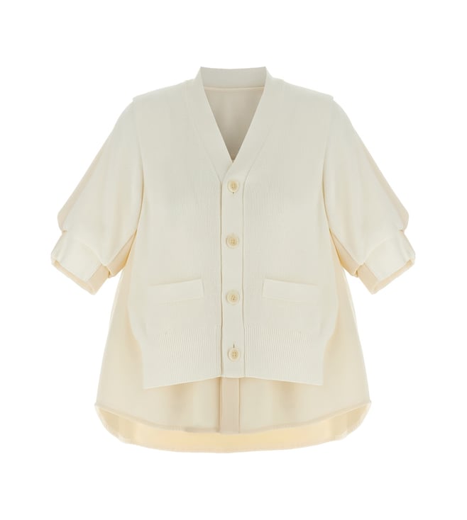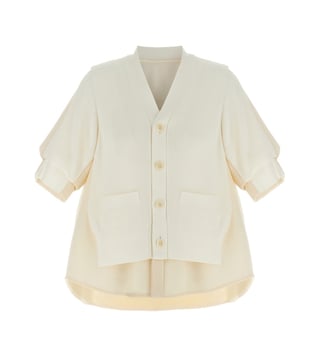 The Sacai White Suiting Mix Knit Cardigan is a masterful blend of elegance and modernity, crafted for the discerning woman. Its pristine white hue is accentuated by an intricate pattern that dances across the fabric, a luxurious mix of 57% cotton and 43% polyester. The cardigan's design is both sophisticated and versatile, featuring a seamless closure that enhances its sleek silhouette. This piece is a testament to Sacai's innovative approach, offering a chic yet comfortable addition to any wardrobe.