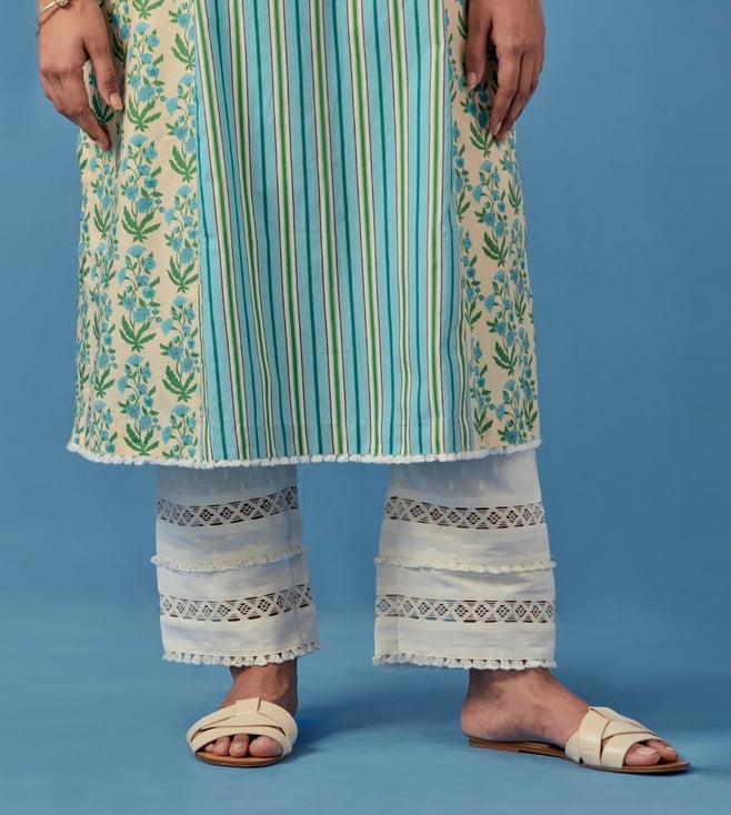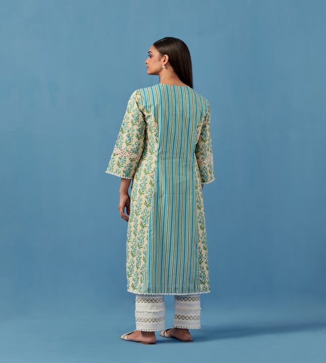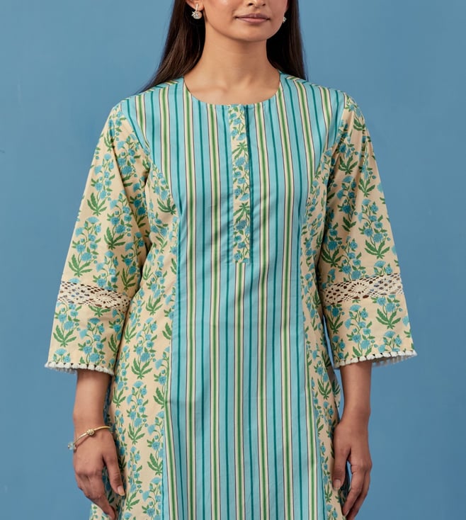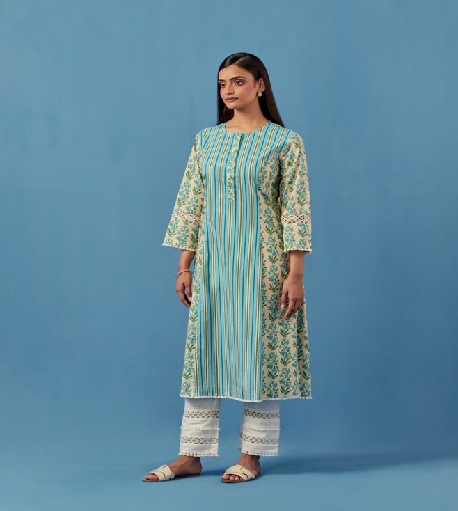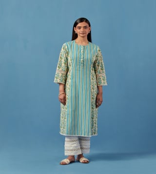 Get your wardrobe ready for any festive season with this beautiful Sage Saga malhaar multi kurta and palazzo set. This set has a 3/4th sleeve kurta made from cotton fabric which makes it comfortable and breathable. You can pair this set with statement jewellery and fashion sandals to complete the look. Perfect for a day out with friends or a family function. Disclaimer: All other items in the image are only for display purposes and will not be a part of the delivery content. Product colour may slightly vary due to photographic lighting sources. Country of Origin - India.