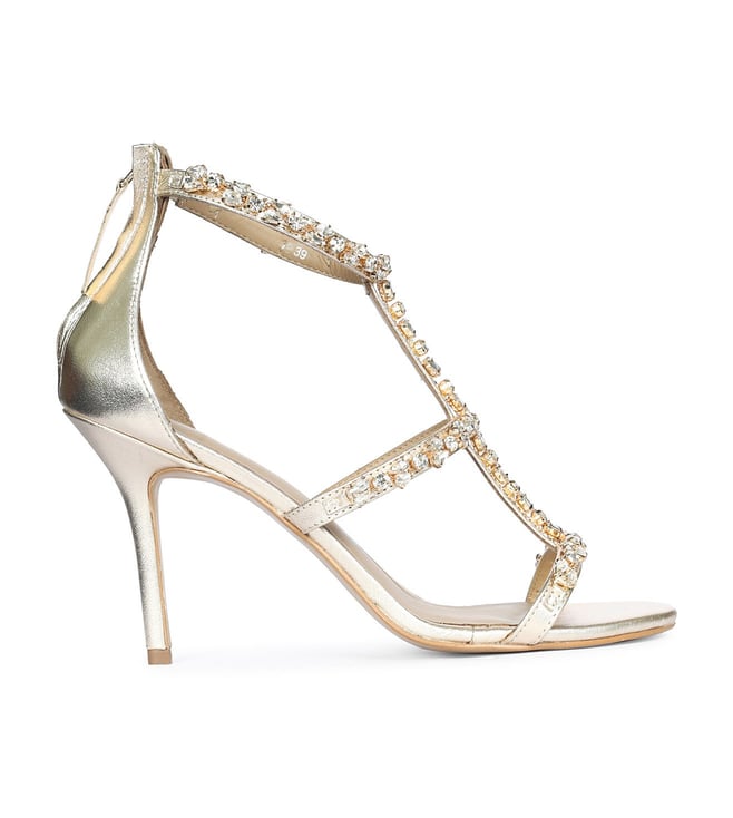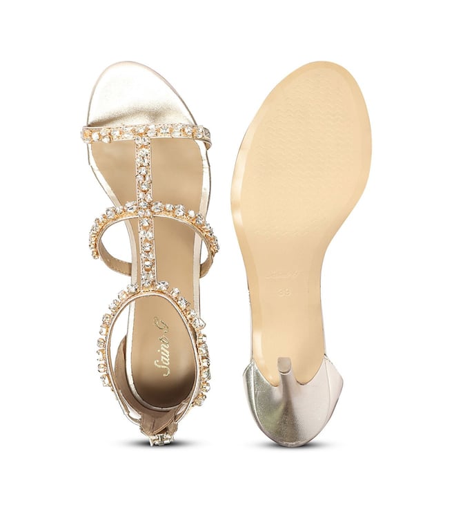 Elevate your casual look with Saint G's Metallic Gold Leather Stilettos. Perfect for women seeking a touch of glamour, these embellished heels blend style and elegance effortlessly. Disclaimer: All other items in the image are only for display purposes and will not be a part of the delivery content. Product colour may slightly vary due to photographic lighting sources. Country of Origin - India.
