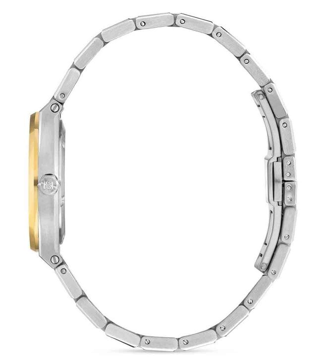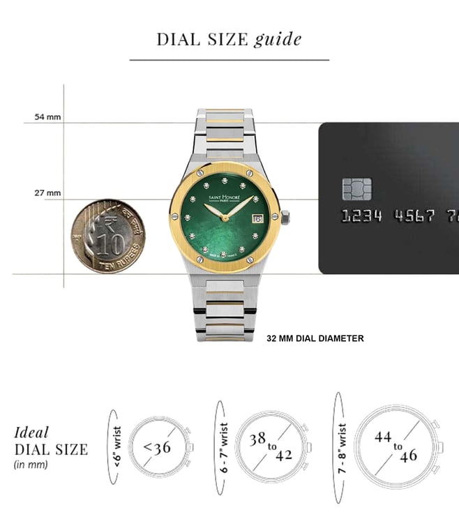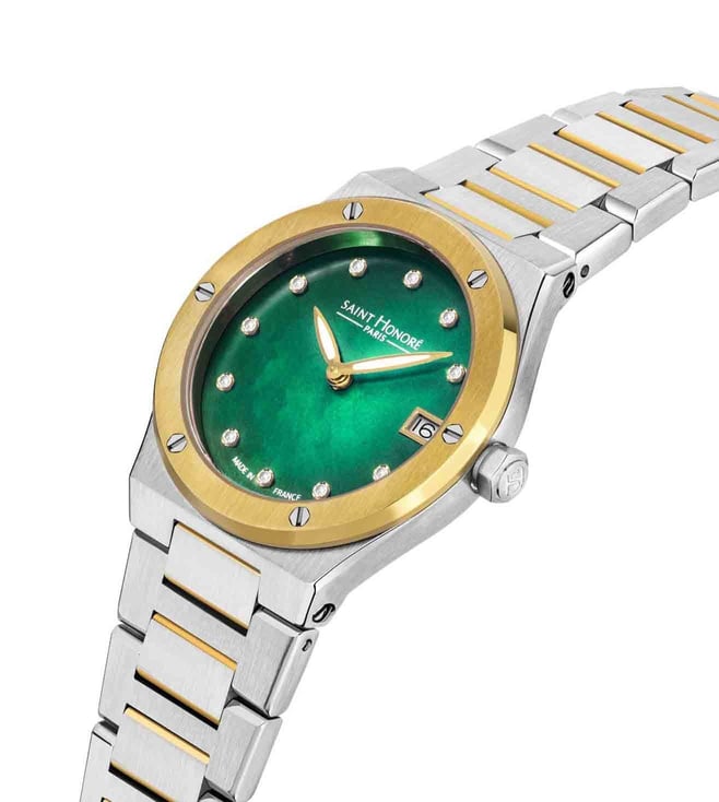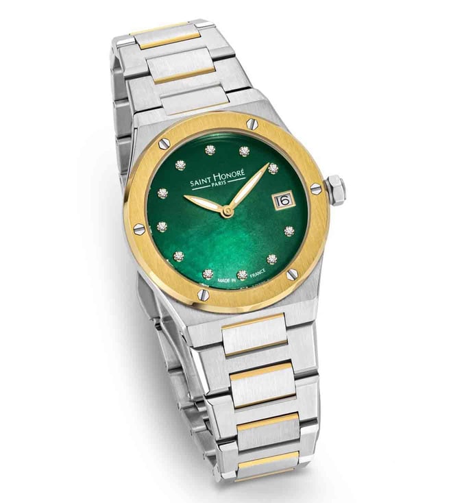 A must have timepiece for all the watch aficionados, this women analog watch from the collection by Saint Honore Paris will be a perfect pick. The green round dial is protected by a mineral glass. It features and a crown for time adjustment. The stainless steel strap comes in a two tone hue that further elevates the look of the timekeeper. Besides, it is completed with a fold over clasp with double push button safety clasp to ensure a secure fit on the wrist.