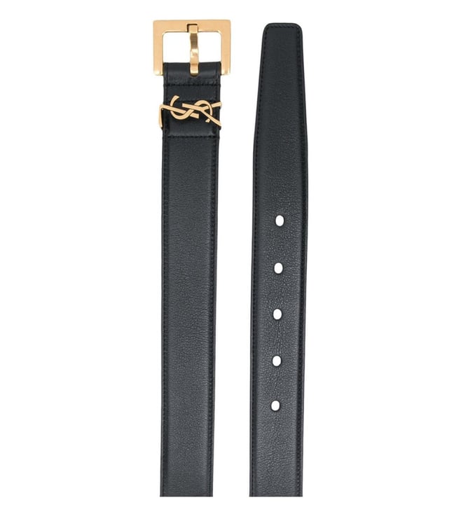 Elevate your everyday style with the Saint Laurent casual black belt. Crafted with the iconic cassandre logo plaque and a sleek gold-tone buckle, this versatile accessory adds a touch of luxury to any outfit. The adjustable fit and punched holes ensure a comfortable and customizable wear, making it the perfect addition to any woman's wardrobe. Make a statement with this timeless piece that effortlessly combines fashion and function.