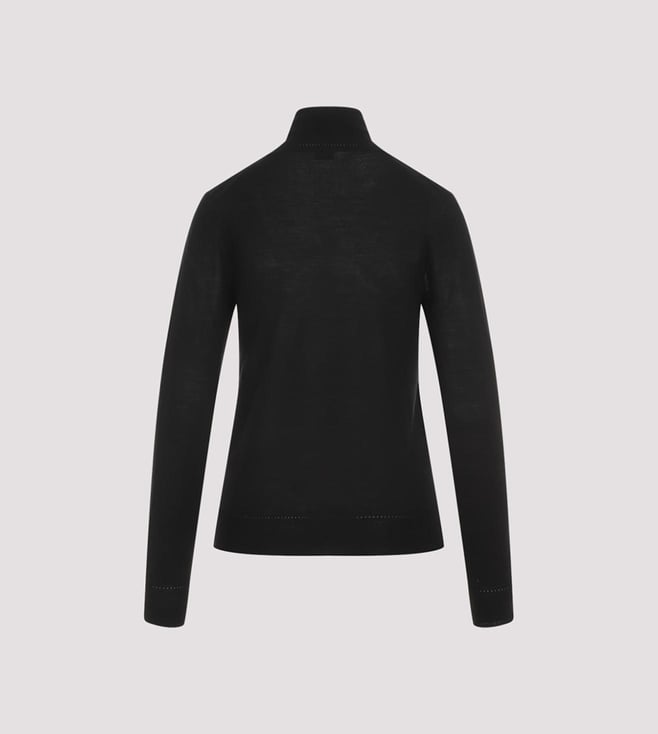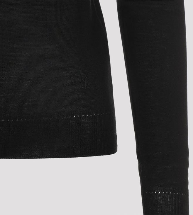 The Saint Laurent Black High Neck Sweater is a masterpiece of elegance and sophistication. Crafted from luxurious 100% wool, this sweater envelops you in warmth and style. Its sleek black hue is timeless, while the intricate pattern adds a touch of modern flair. Designed for the discerning woman, the high neck offers a chic silhouette, perfect for any occasion. The closure ensures a snug fit, making it an essential addition to your wardrobe, embodying the essence of refined fashion.