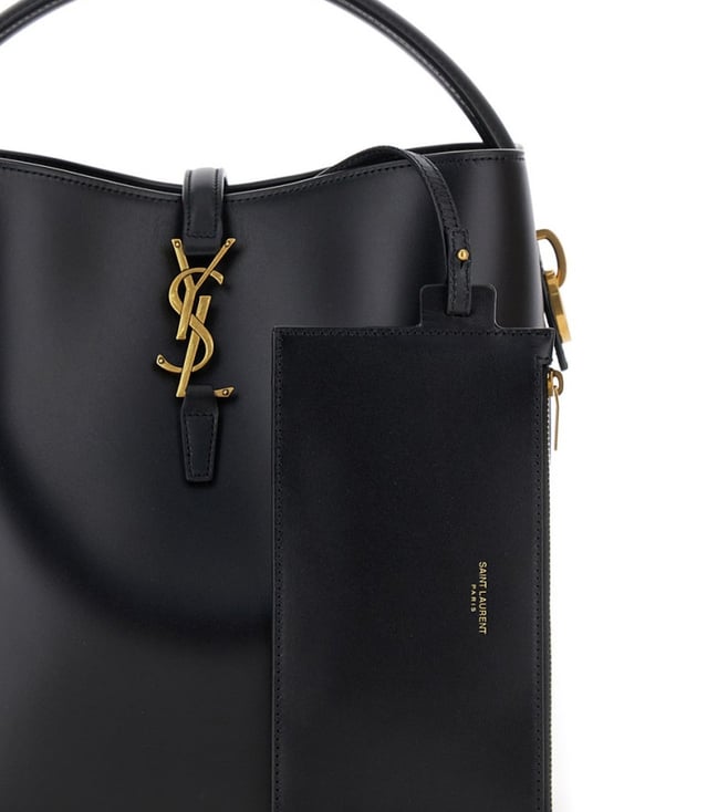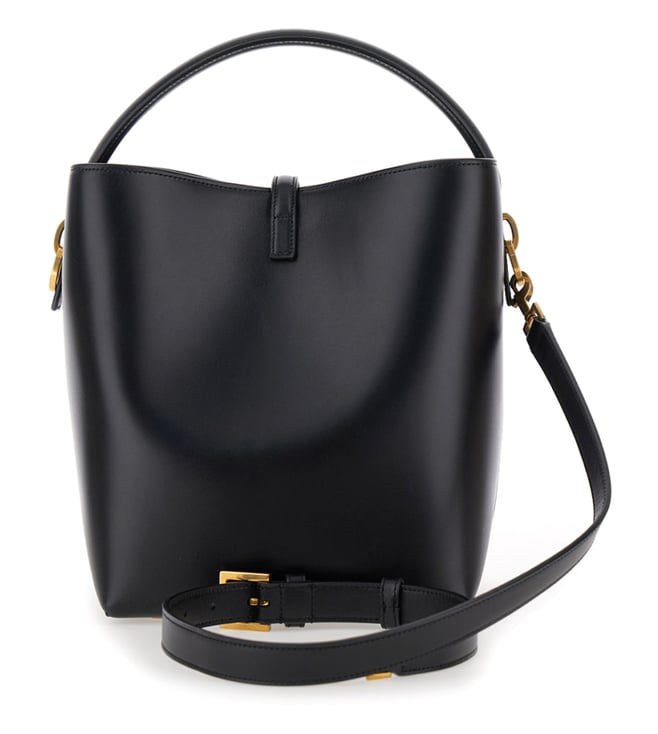 Black leathersmooth grainbucket bodysingle flat top handleadjustable detachable shoulder strapsignature cassandre logo plaquemetal feetmain compartmentinternal logo stampdetachable internal zipped pouchgold-tone hardware
