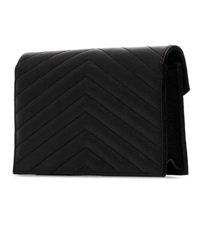 Black leather Envelope matelass clutch from SAINT LAURENT featuring envelope design, logo plaque, matelass effect and chain-link shoulder strap. With its timeless design and practical features, this bag is a must-have accessory for the modern woman on-the-go.