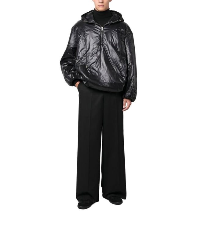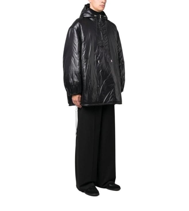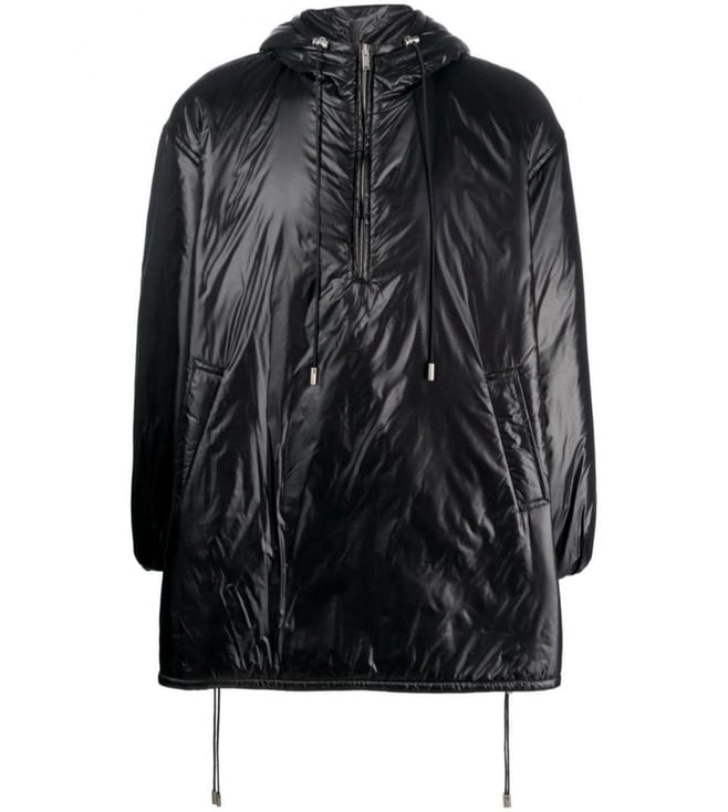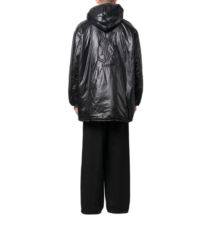 Elevate your style with the Saint Laurent Black Regular Fit Jacket. Cassandre anorak oversized hooded coat from saint laurent featuring jet black, design, glossy finish, embroidered logo to the rear, slouchy drawstring hood, half front zip fastening, two side welt pockets, drop shoulder, long sleeves, elasticated c lining: polyester this piece fits true to size. recommend you get your regular size model is 1,84m / 6ft 1in wearing size 48 (it).