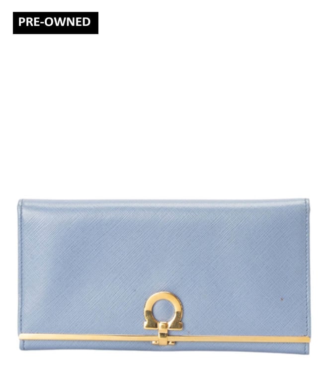 Crafted from premium blue leather, this Salvatore Ferragamo wallet combines timeless elegance with functionality. Accented by gold-tone hardware, it features a durable nylon-lined interior with thoughtfully arranged card slots to keep your essentials organized. In good condition, it shows signs of creasing on the sides, minor exterior stains, and light scratches on the hardware, while the interiors remain well-maintained, making it a sophisticated everyday accessory.