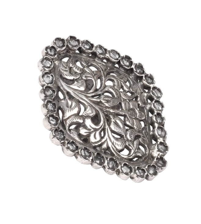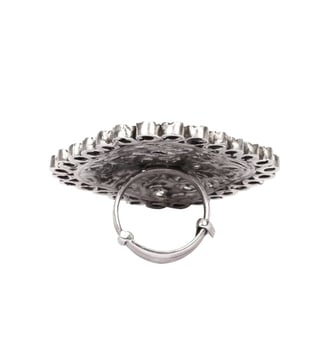 Adorn yourself with the elegant Sangeeta Boochra Silver Ritisha Engraving Ring and elevate your festival look. Made of silver, this ring boasts beautiful engravings that add a touch of sophistication. A must-have for the festive season!' Disclaimer: All other items in the image are only for display purposes and will not be a part of the delivery content. Product colour may slightly vary due to photographic lighting sources. Country of Origin - India.