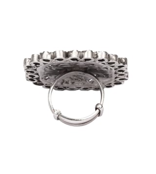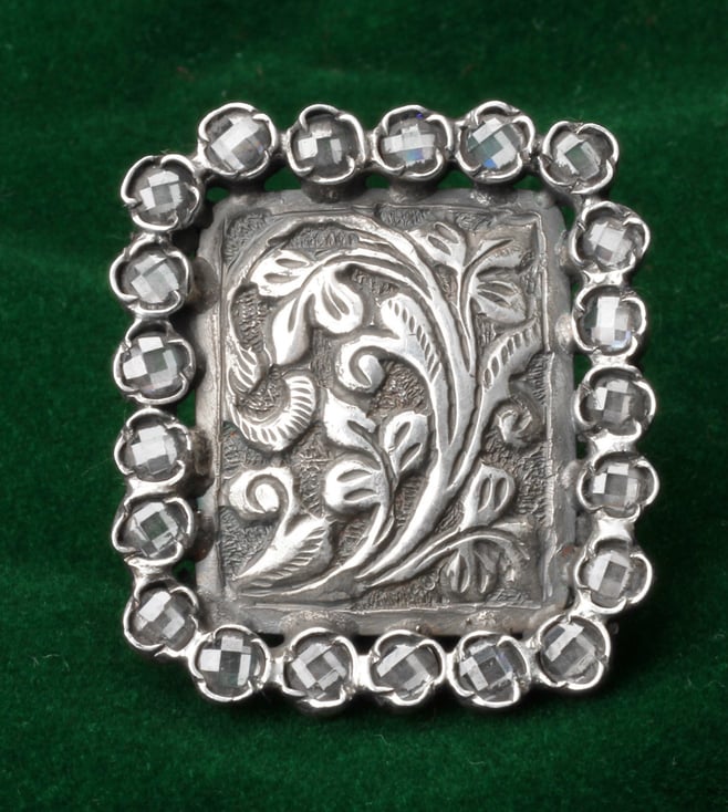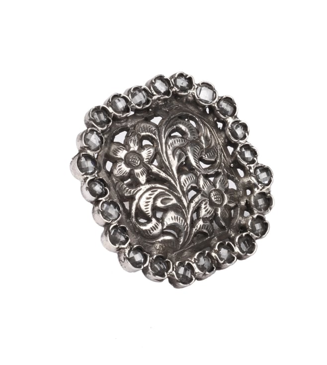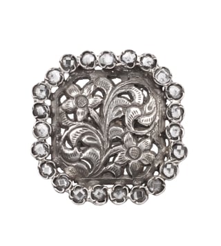 Add a touch of elegance to your festive ensemble with this gorgeous silver Shanaya Engraving Ring from Sangeeta Boochra. Made from premium quality silver, this ring is perfect for any occasion.' Disclaimer: All other items in the image are only for display purposes and will not be a part of the delivery content. Product colour may slightly vary due to photographic lighting sources. Country of Origin - India.