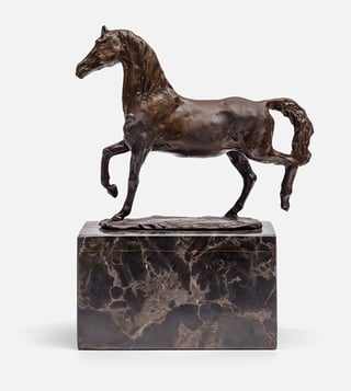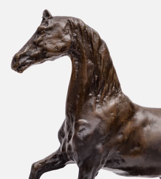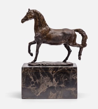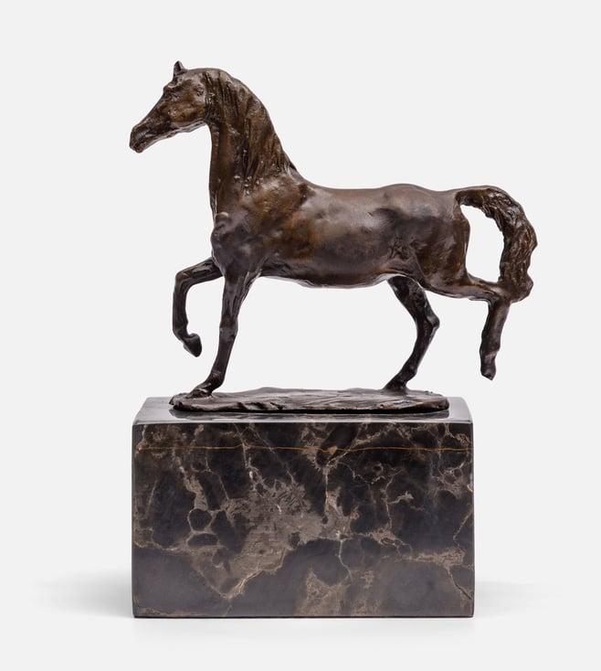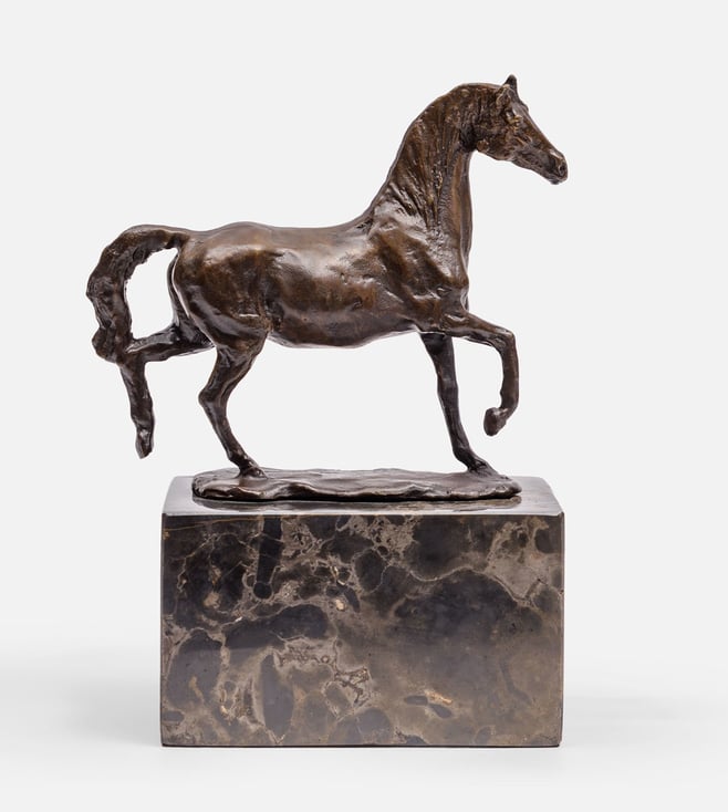 Overview: The Horse Trot sculpture in bronze embodies the effortless harmony between horse and rider, where quiet dignity masks immense power. The sculptor captures a fleeting moment of calm, reflecting the deep, unspoken bond that transforms them into a formidable duo.Design Story: The brown patina on bronze technique has been used since antiquity, seen in Greek and Roman bronzes, giving sculptures an aged, timeworn elegance. Patination not only enhances visual depth but also protects the metal, making it a hallmark of classical and modern bronze artistry.
