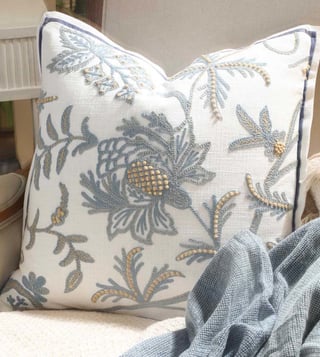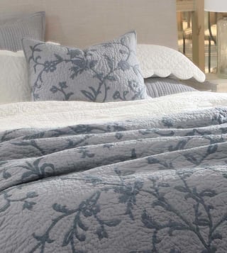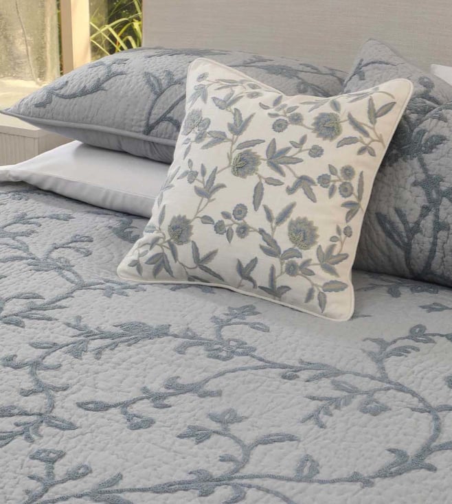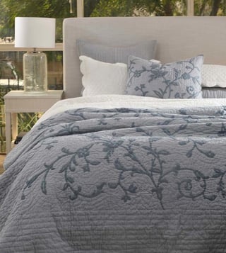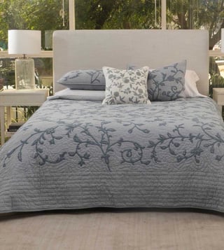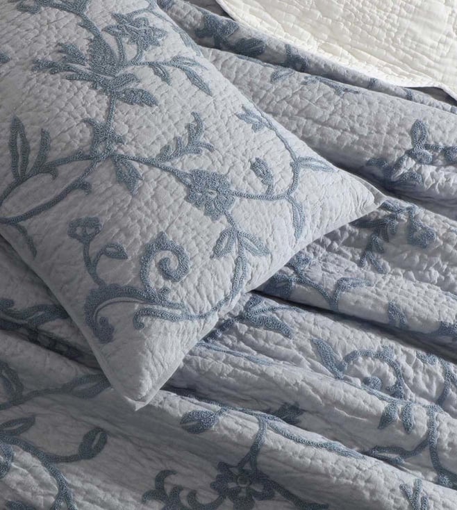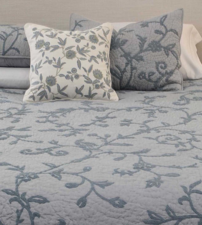 This 100 percent cotton quilted bedspread is a result of a love for the aesthetics of the French style interpreted through the ancient art of Indian needlework. The designs and colours are inspired by 18th Century French textiles, ribbons and embroideries updated to appeal to the modern eye. Exclusive and authentic, it reflects the subtle elegance of French design with unique hand embellishment. Disclaimer: All other items in the image are only for display purposes and will not be a part of the delivery content.