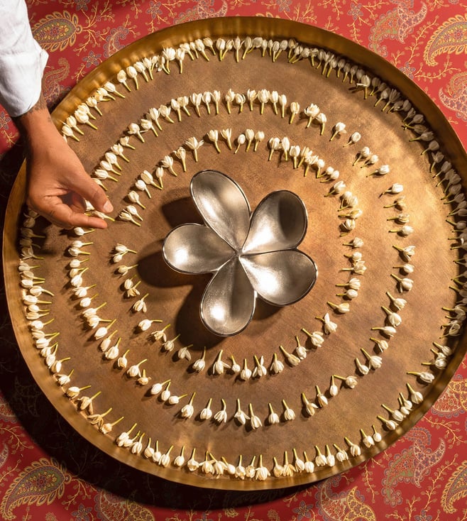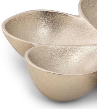 Like the petals of a Champa flower caught mid-bloom, the Champaka Bowl captures the beauty of nature in its raw form. Each curve and fold mimics the delicate flow of life energies. The matte nickel finish lends the piece an ethereal sheen, as if kissed by moonlight. The Champaka bowl is a work of art and a statement piece, that is perfect for honouring Diwali¿s spirit of renewal and spiritual awakening.