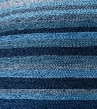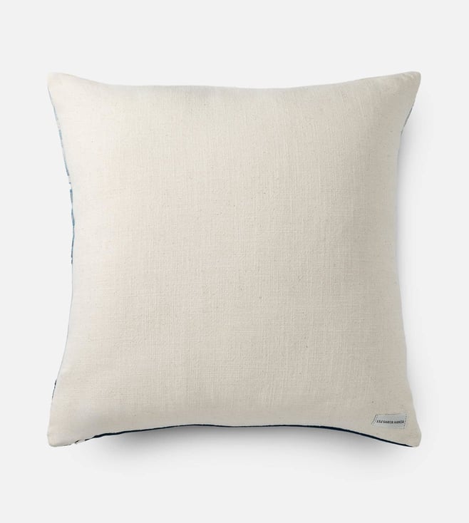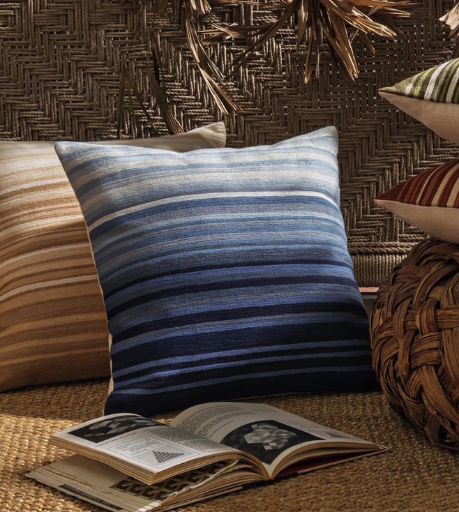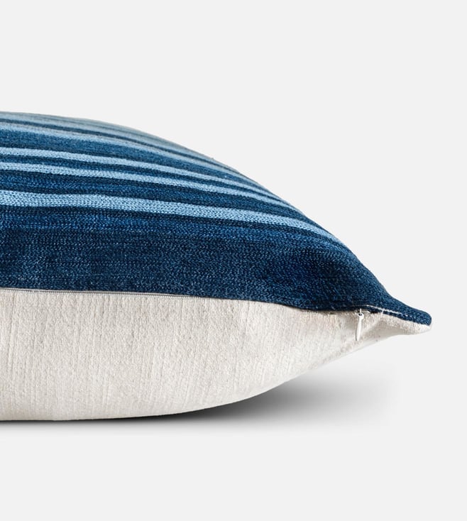 The OMBRE STRIPE cushion is an embroidered cushion in natural color, inspired by the gradient effect. The tonal embroidery blends shades of blue to create a soft, flowing transition on a cotton slub base. The fine Aari embroidery adds raised detailing, while the slub weave enhances the cushion¿s organic texture, ensuring a rich tactile experience. Design Story: Aari embroidery, rooted in 16th-century Mughal India, lends its fine, chain-like stitchwork to this design, creating a seamless gradient effect.