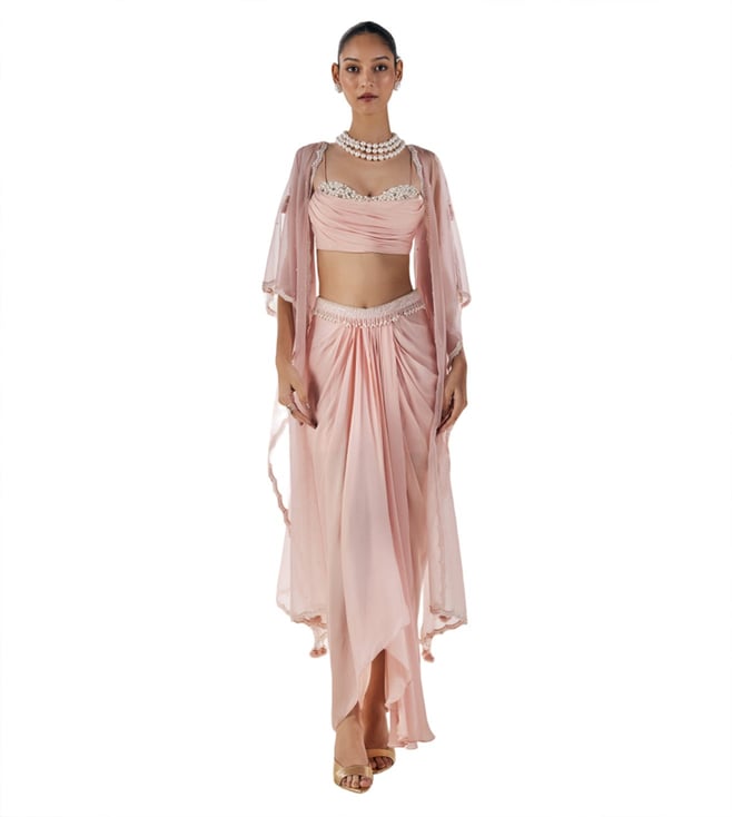 Peach Revival Satin Georgette Draped Skirt with Belt and Blouse with Soft Organza Cape