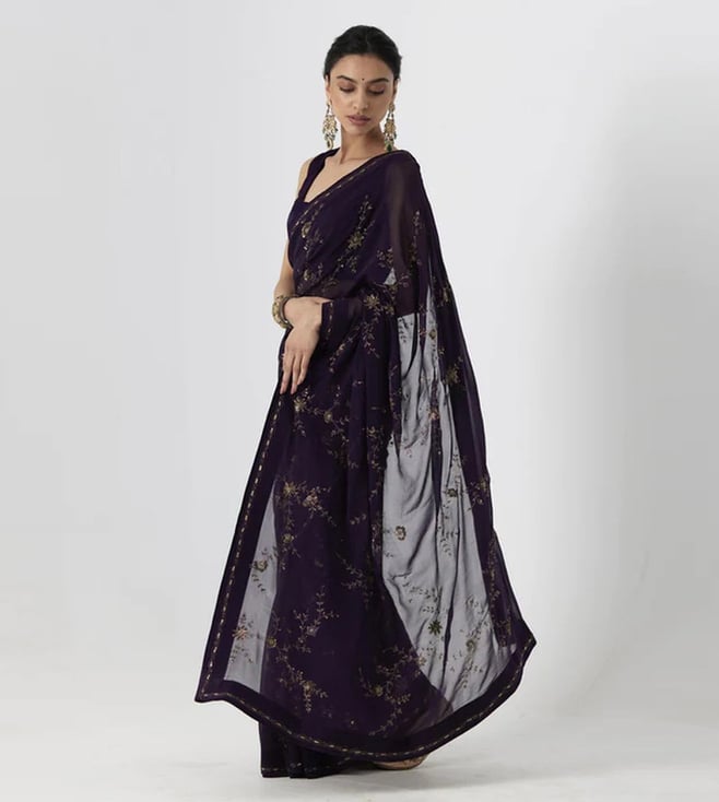 Aubergine Yutika Chiffon Hand Embroidered Chiffon Saree with Blouse and Petticoat