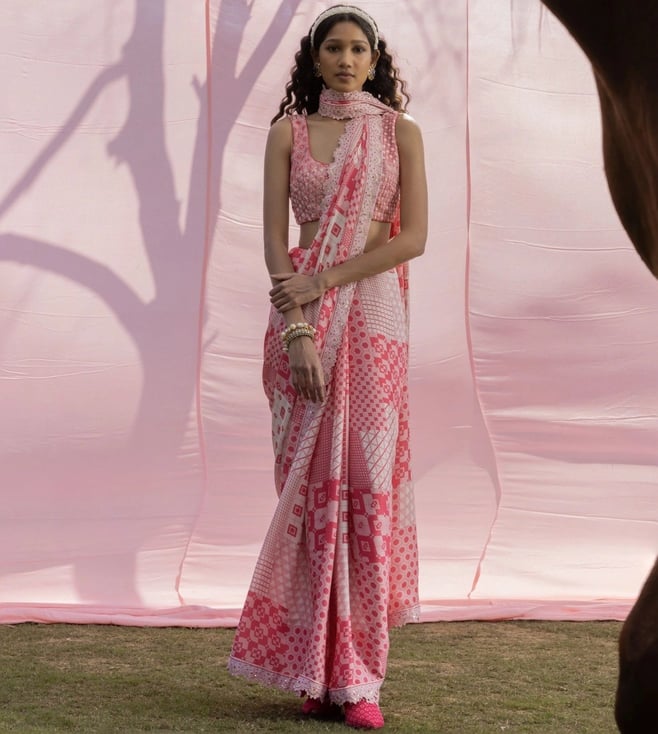 Ivory, Masoom Gulaabi and Moonga Modern Jaipur Printed Saree With Blouse