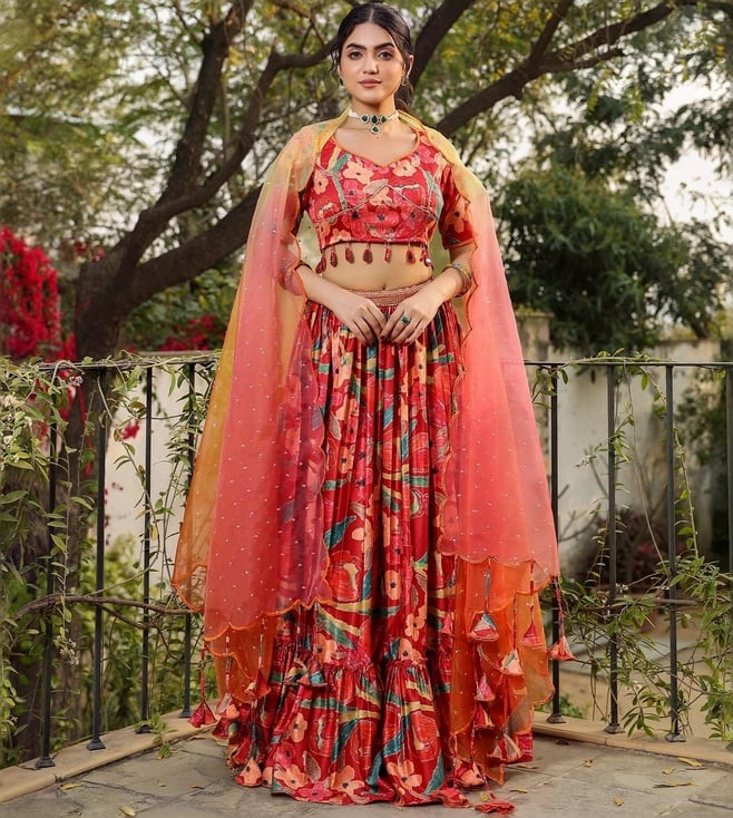 Cherry Red & Yellow Printed Satin Lehenga Set With Blouse And Dupatta
