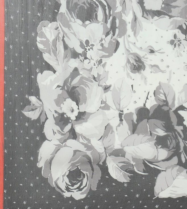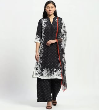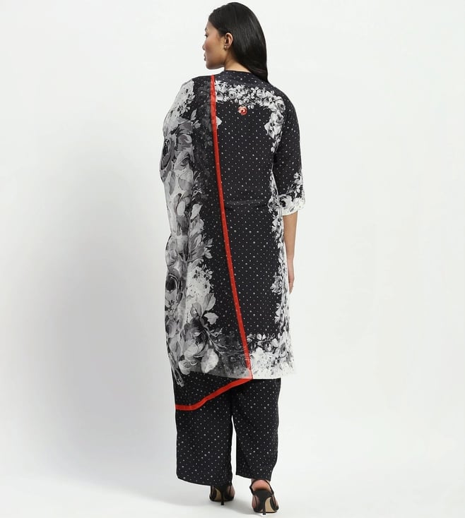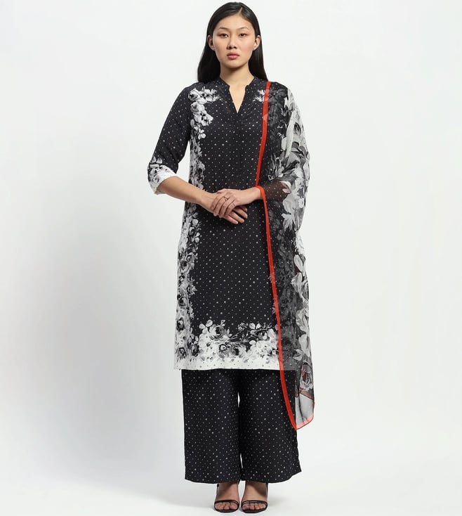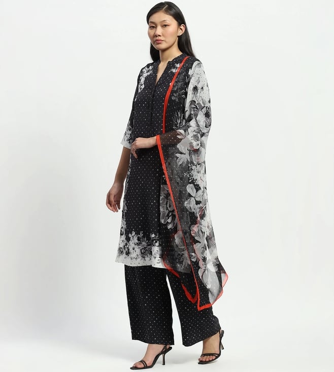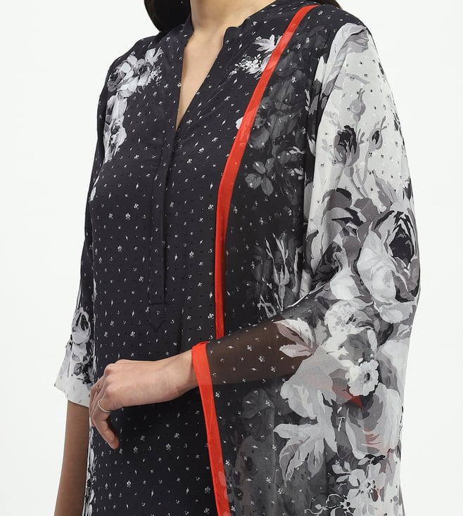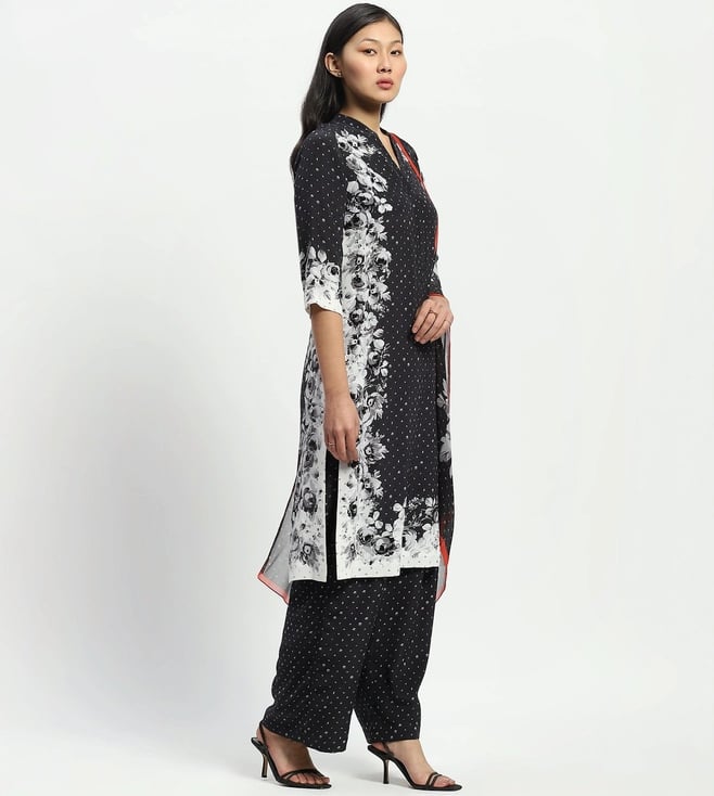 SATYA PAUL Black & White Negative Rose Kurta with Bottom and Stole