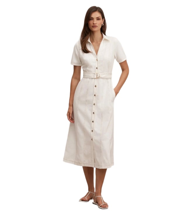 Women Beige Solid Pure Cotton Round Neck Straight Dress