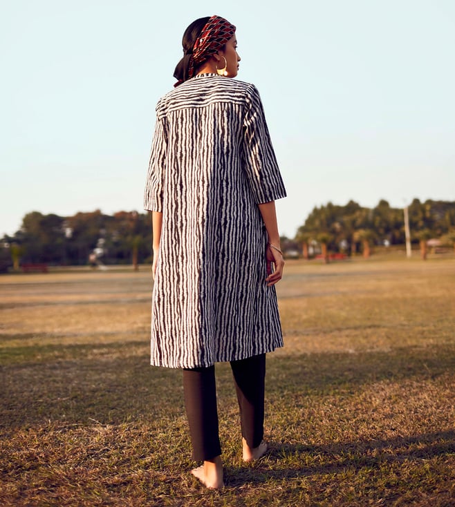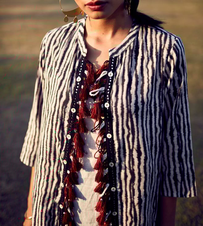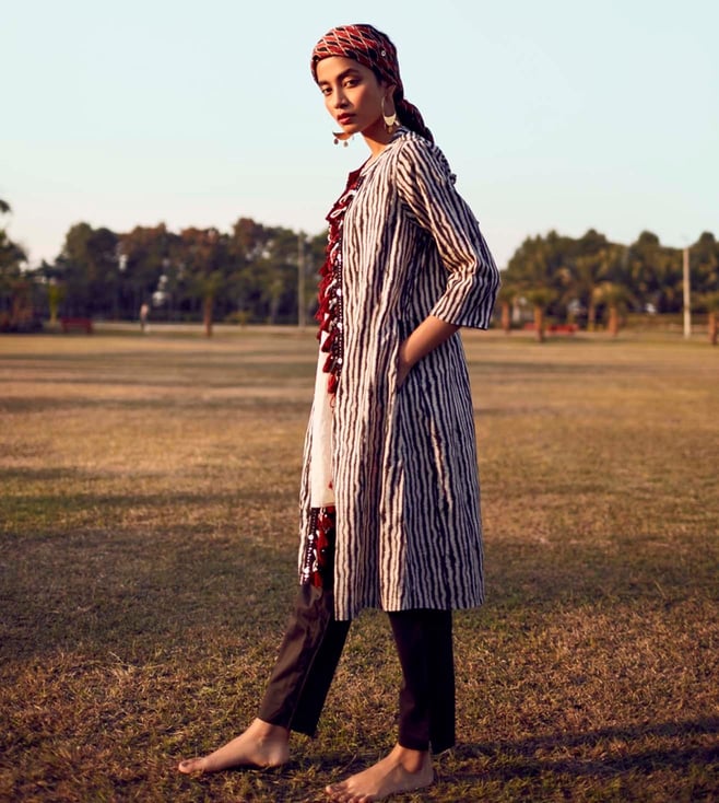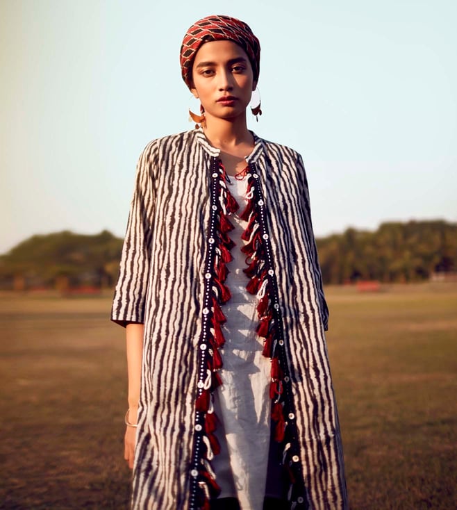 Curate a stylish look by wearing this white jacket from the Behrukh collection by Saundh. Tailored to sartorial perfection from cotton viscose slub, it assures a soft and soothing touch against the skin. The band neck adds to its appeal. Featuring three-fourth sleeves, it will surely impress your peers. Disclaimer: All other items in the image are only for display purposes and will not be a part of the delivery content. Product colour may slightly vary due to photographic lighting sources.