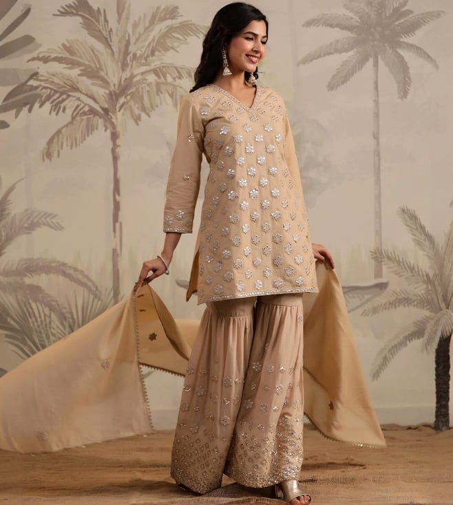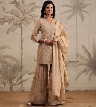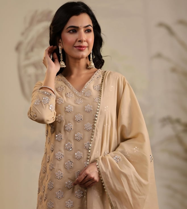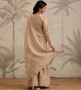 Beige Mulmul Mirror Embroidered Kurta with Sharara and Dupatta