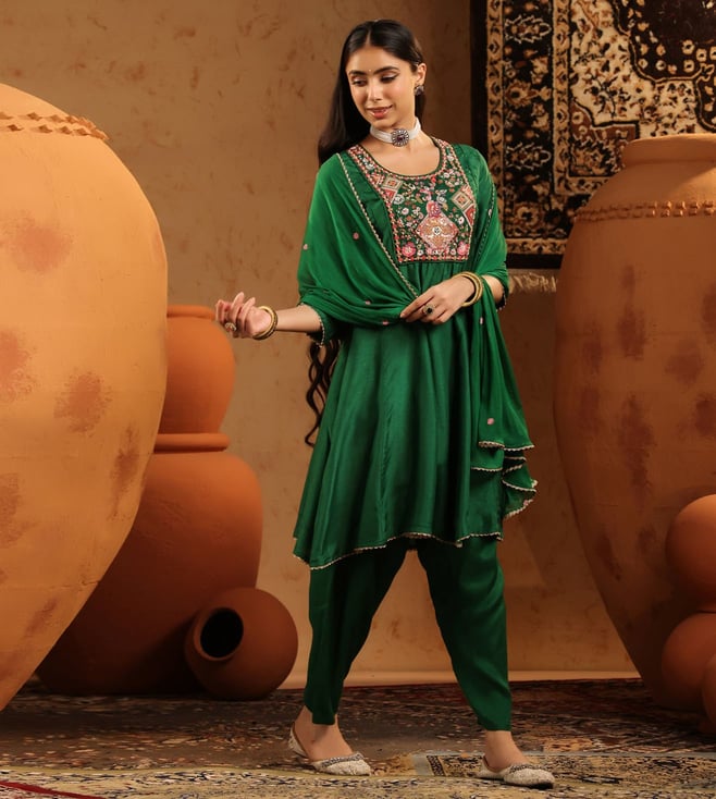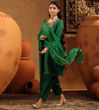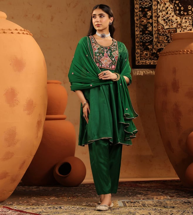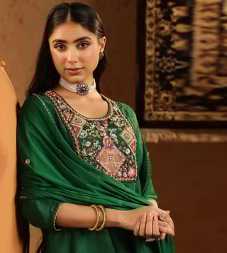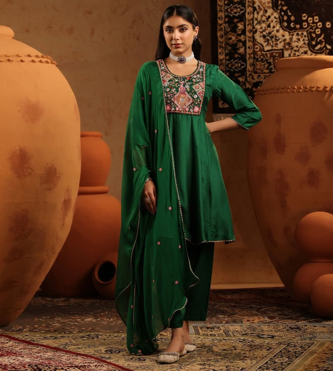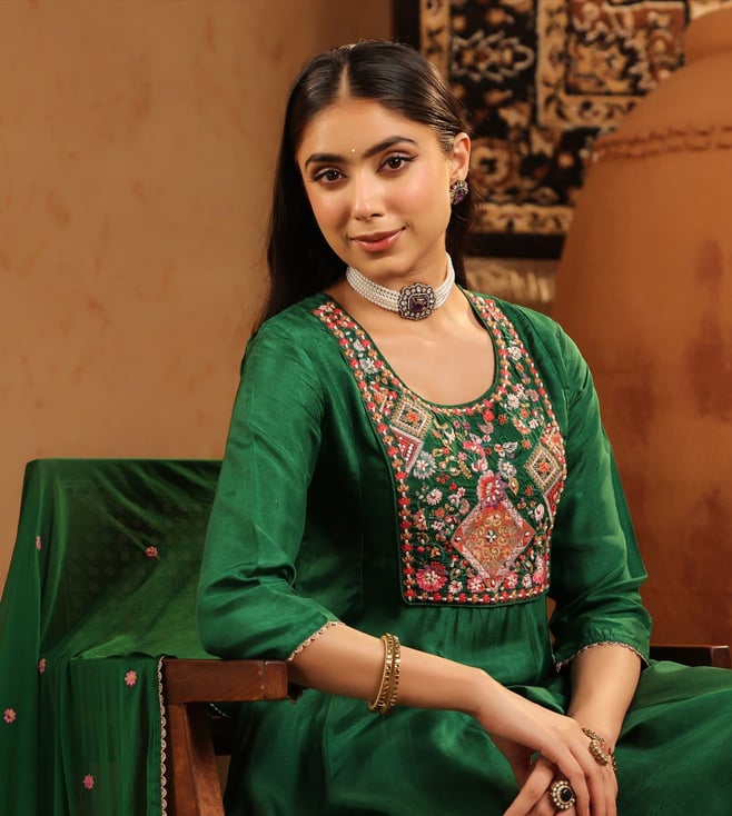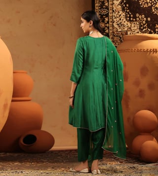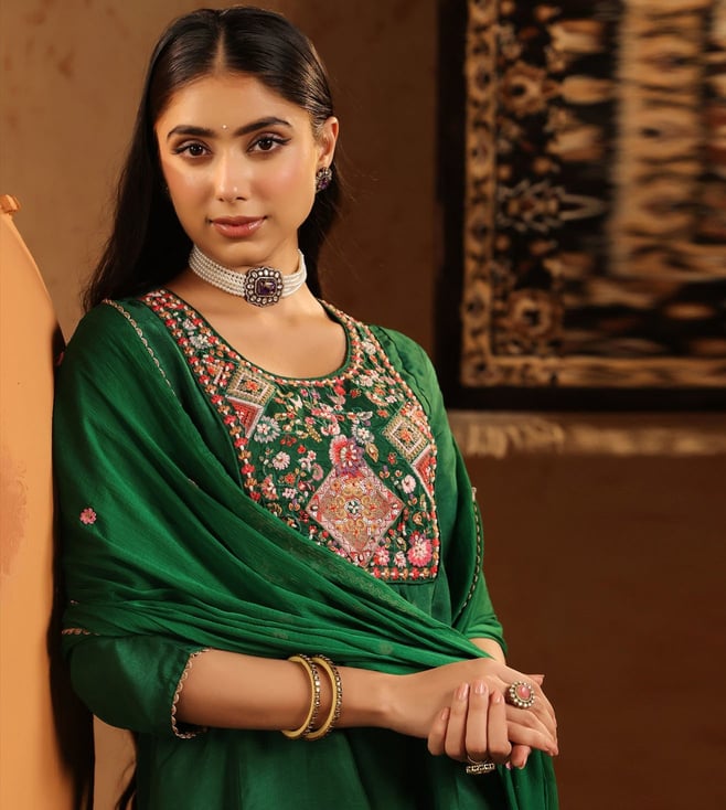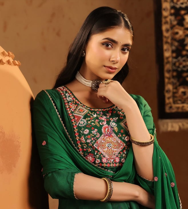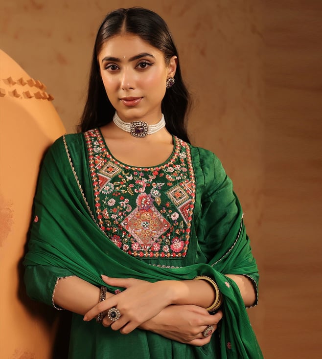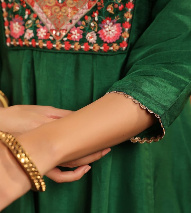 Crafted in rich Russian silk, this green Anarkali suit set is a graceful blend of traditional artistry and modern elegance. The panelled kurta features intricate colourful thread embroidery on the yoke, beautifully enhanced with hand-applied beadwork for a subtle festive charm. Lace trims along the hemline lend a refined and delicate finish. Tailored with a classic round neckline, 3/4th sleeves, and a flared panelled silhouette, the kurta is lined with soft cotton voile for breathable, all-day comfort. The set is paired with solid shantoon salwar and a light chiffon dupatta.