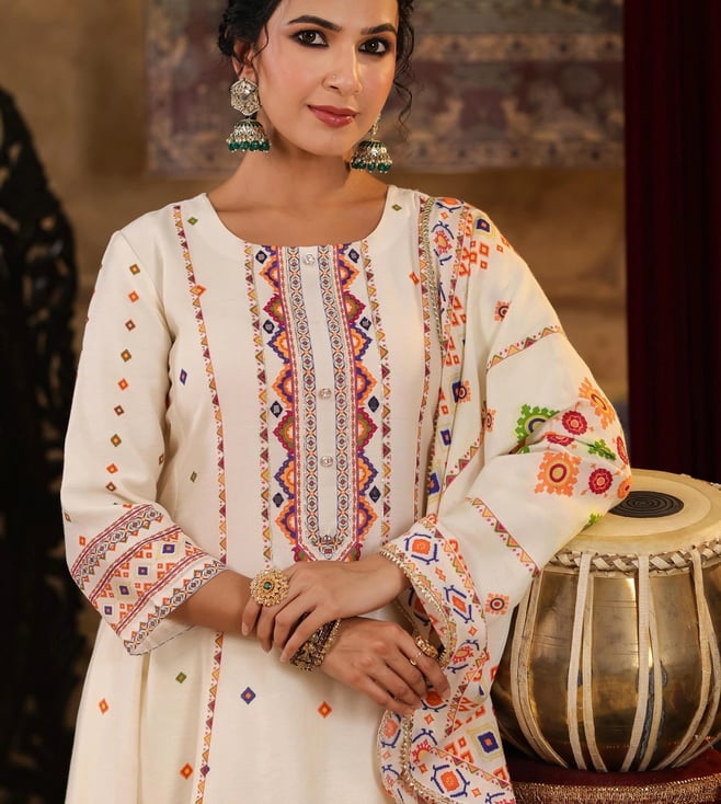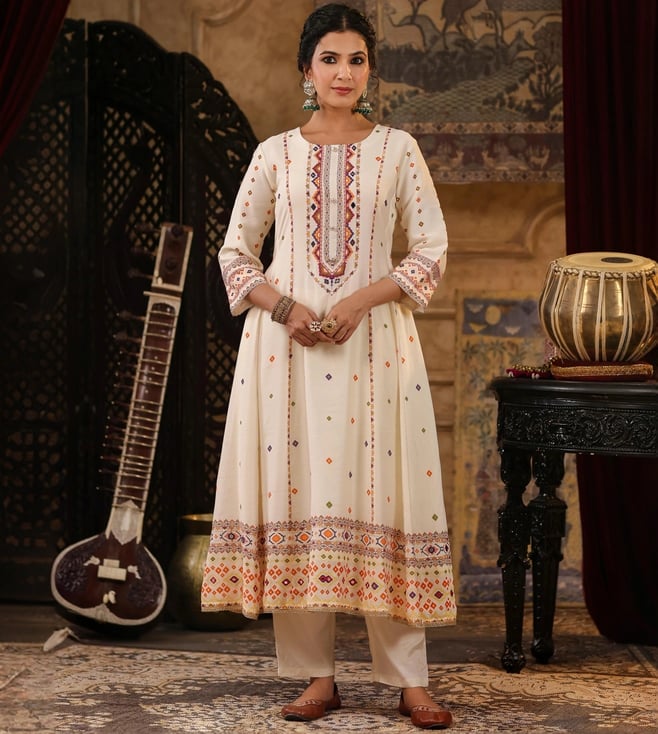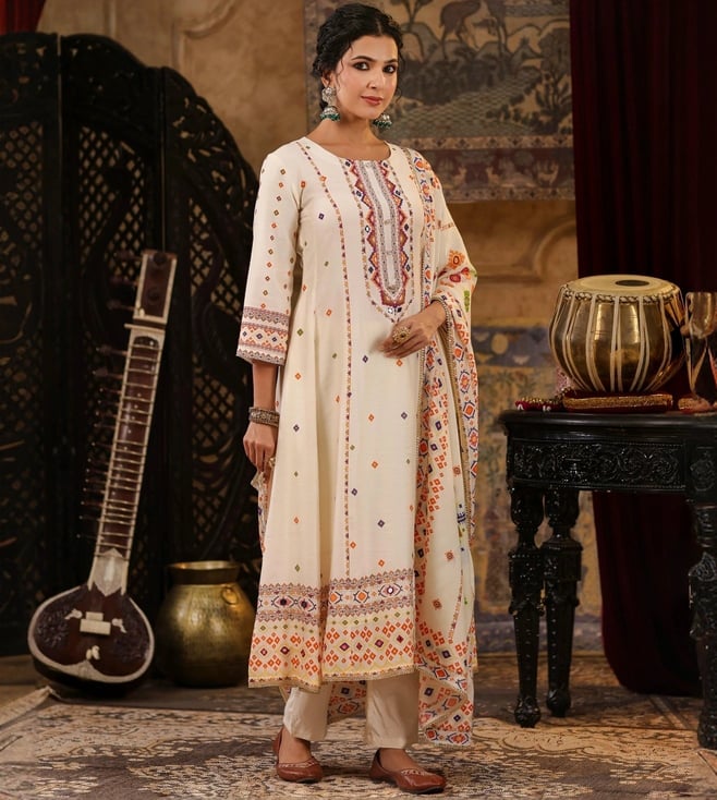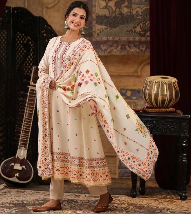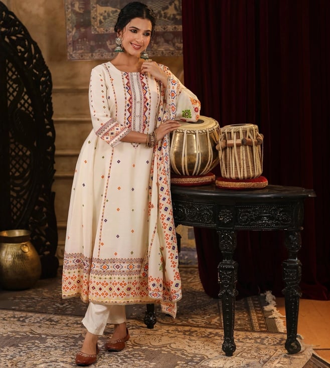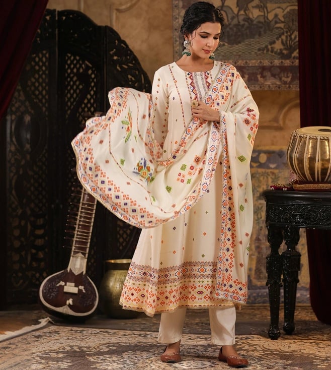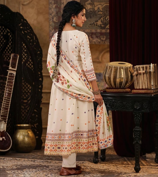 SCAKHI Ivory Chanderi Silk Patola Printed Anarkali Kurta with Pant and Dupatta