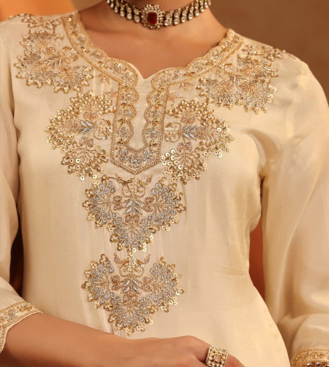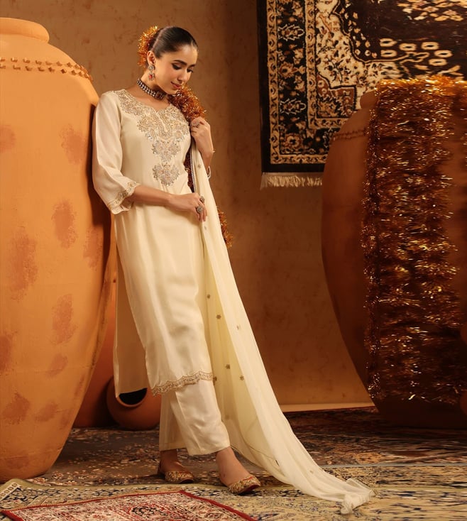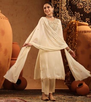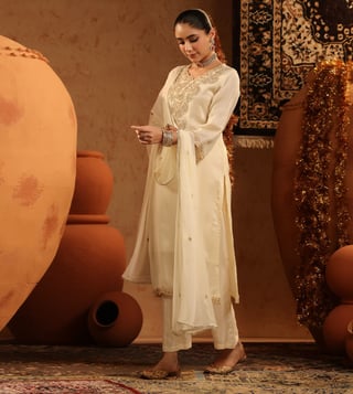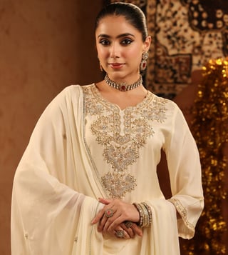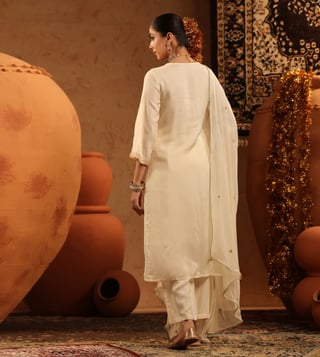 A vision of refined elegance, this Ivory Russian Silk Straight Suit Set is designed to make a subtle yet striking statement. The straight kurta features intricate zari and dori embroidery on the yoke and bottom, elevated with delicate sequin and bead handwork for a graceful festive glow. Crafted with a flattering sweetheart neckline, 3/4th sleeves, and side slits that allow easy movement, the kurta is fully lined with breathable cotton voile for all-day comfort. It is paired with solid shantoon pants and a soft chiffon dupatta, finished with dainty lace detailing along the edges.