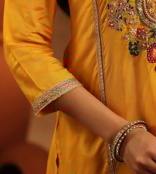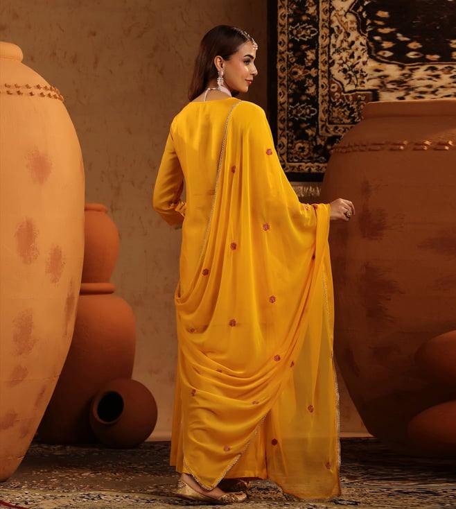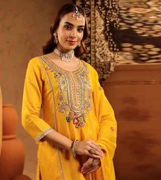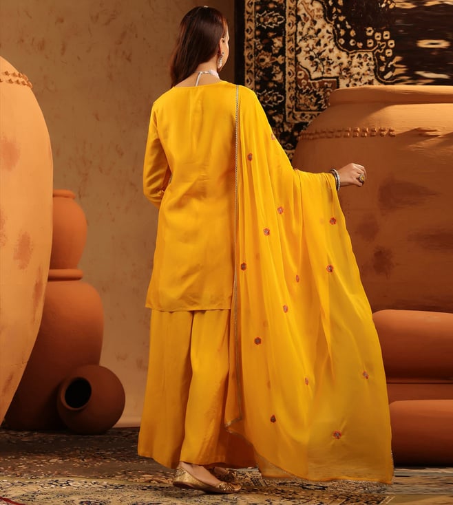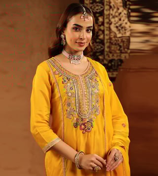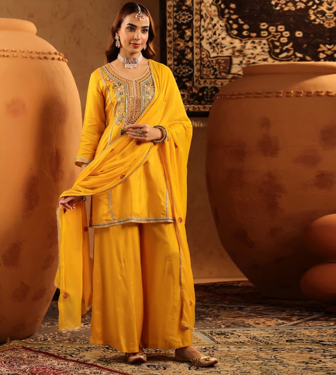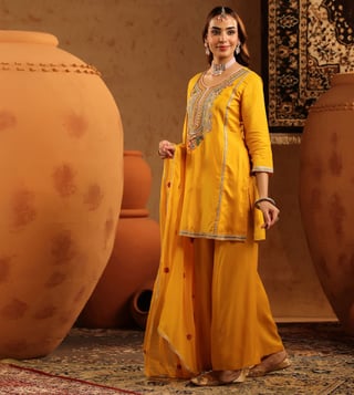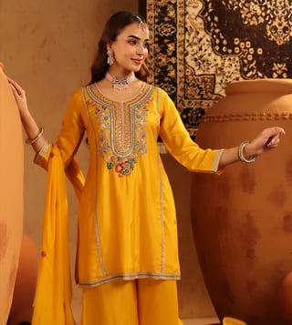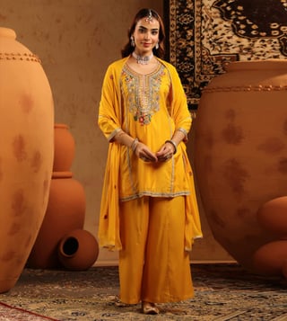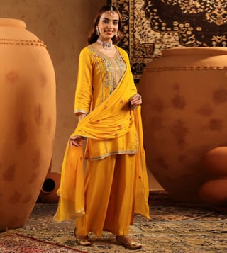 A vision of refined elegance,this mustard Russian silk sharara set is designed to make a subtle yet striking statement.The straight kurta is adorned with intricate thread and sequin embroidery on the yoke and front,beautifully elevated with delicate bead handwork that adds a graceful festive shimmer.Styled with a classic round neckline,3/4th sleeves, and side slits for ease of movement,the kurta is fully lined with breathable cotton voile to ensure all-day comfort.It is paired with a solid shantoon panelled sharara and a soft chiffon dupatta,finished with dainty lace detailing along the edges.