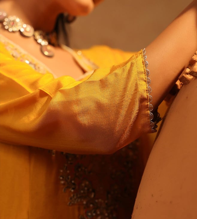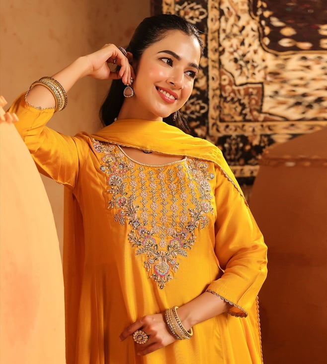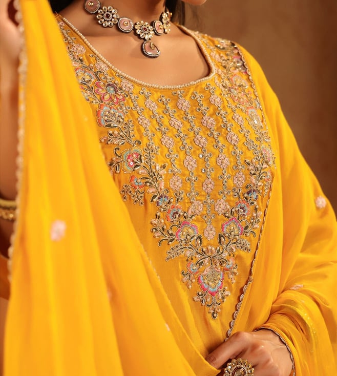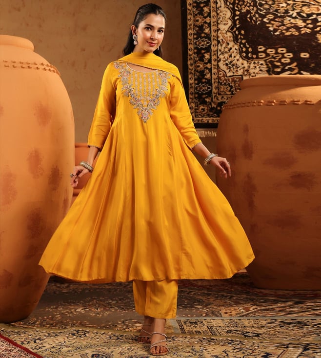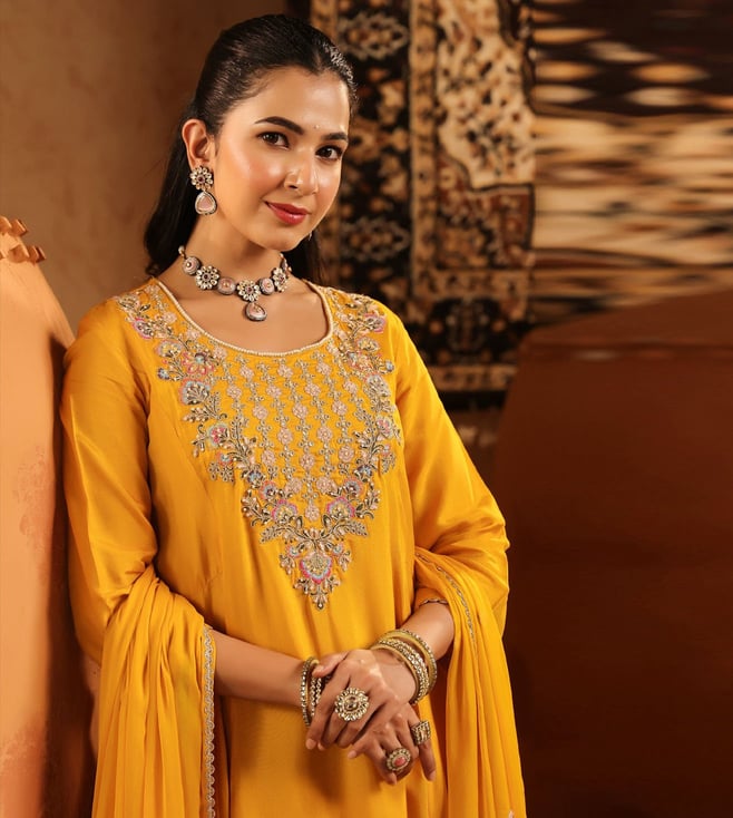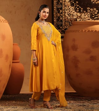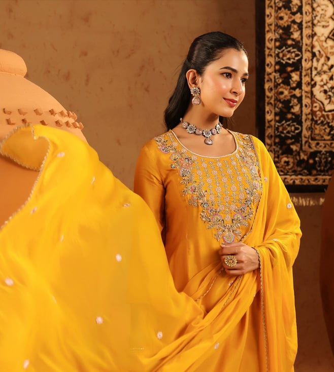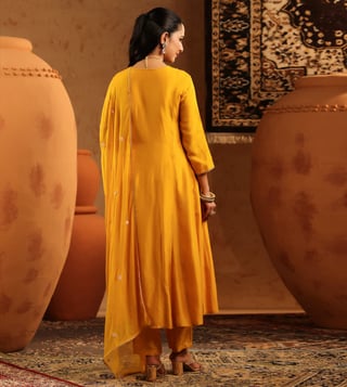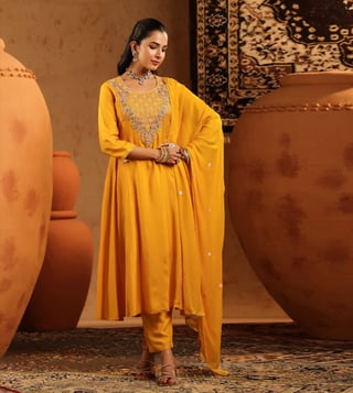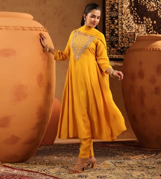 Crafted in rich Russian silk, this mustard Anarkali suit set is a graceful blend of traditional artistry and modern elegance. The panelled kurta features intricate colourful thread and zari dori embroidery on the yoke and sleeves border, beautifully enhanced with hand-applied beadwork for a subtle festive charm. Tailored with a classic round neckline, 3/4th sleeves, and a flared panelled silhouette, the kurta is lined with soft cotton voile for breathable, all-day comfort. The set is paired with solid shantoon pants and a light chiffon dupatta, finished with delicate embroidery.