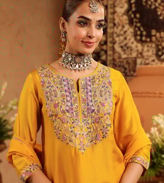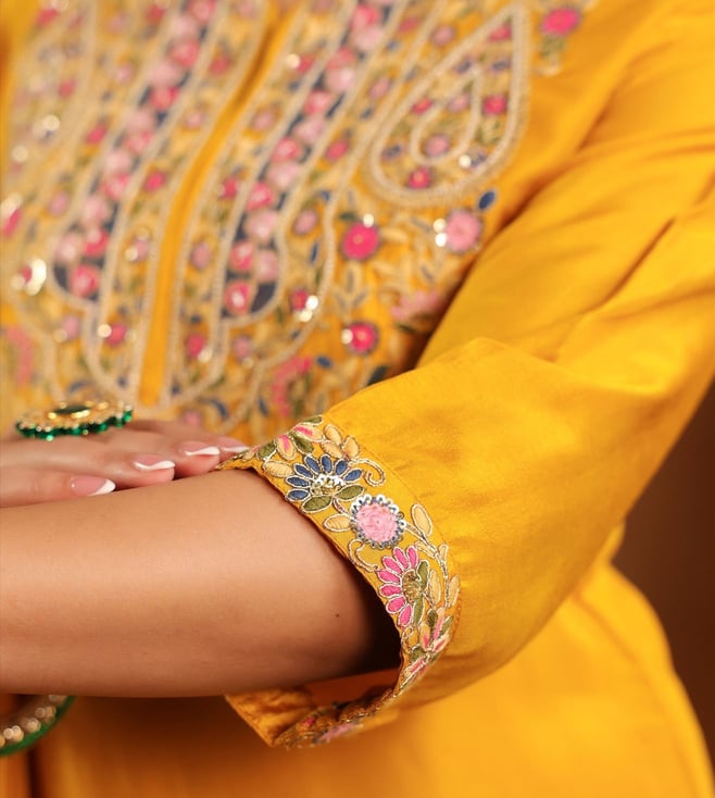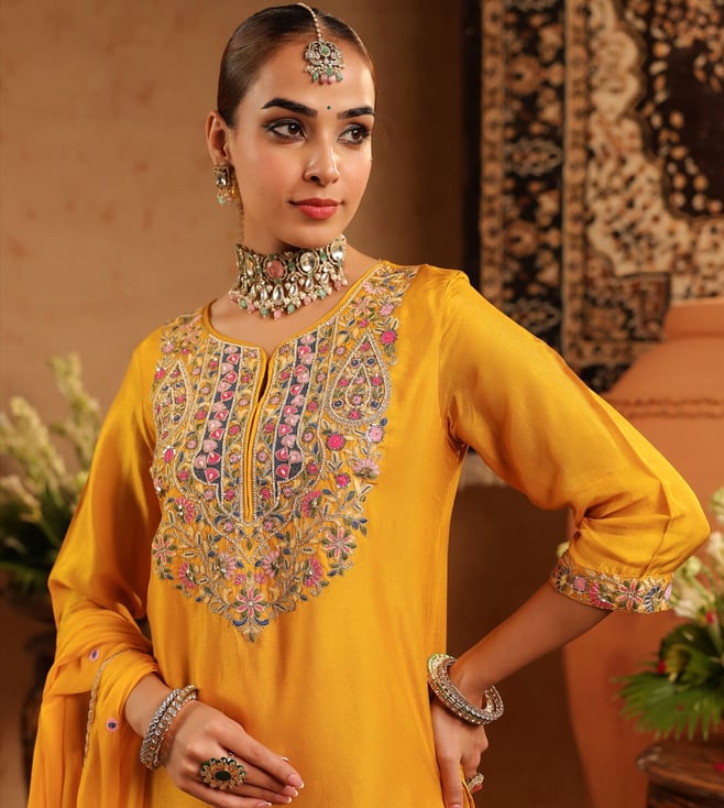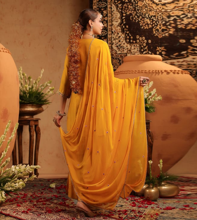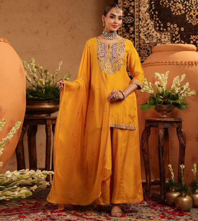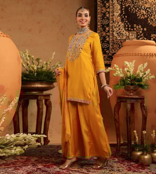 SCAKHI Mustard Pure Silk Regular Fit Suit Set